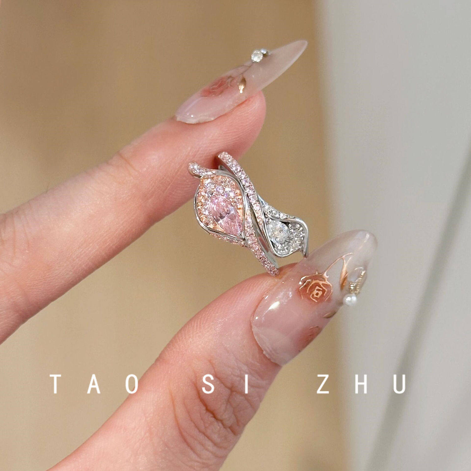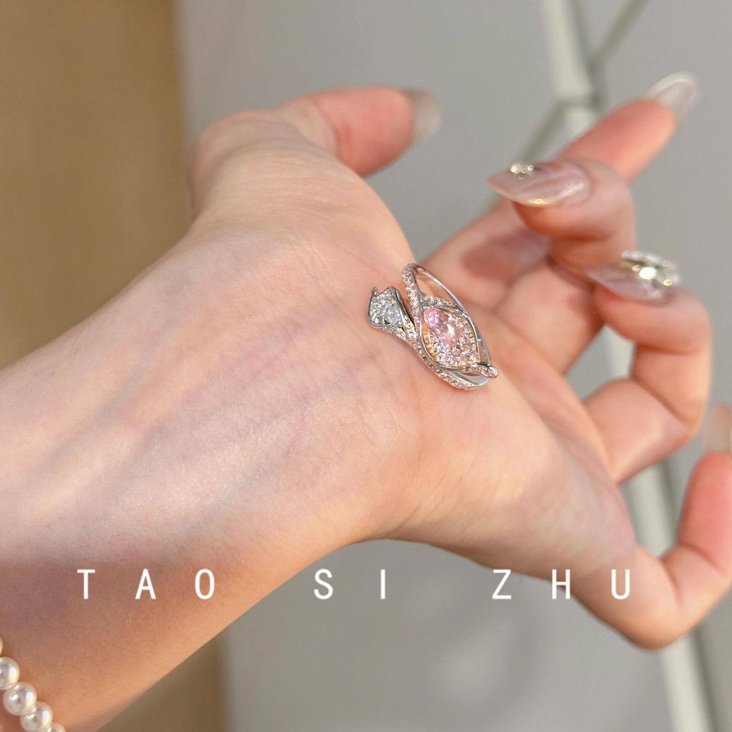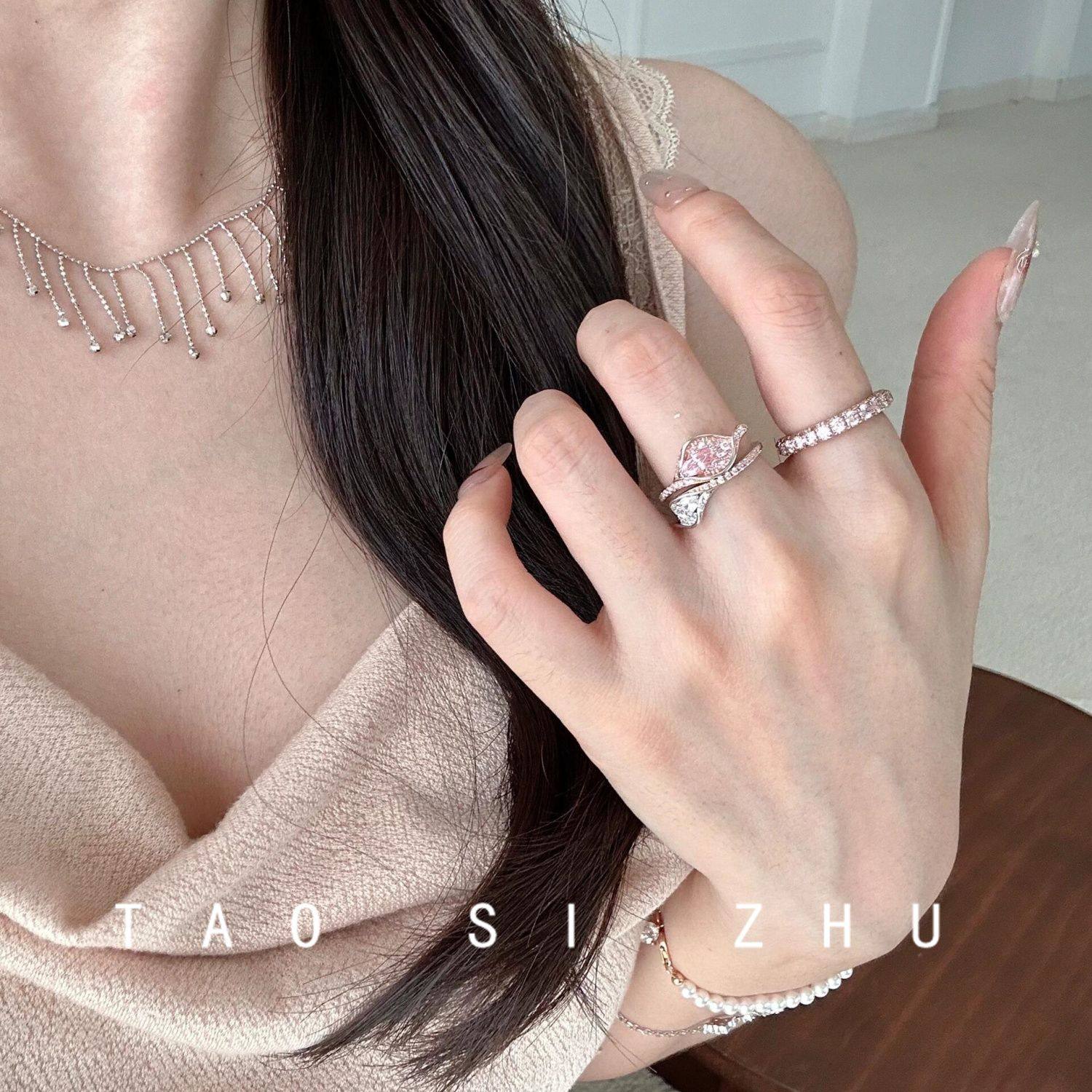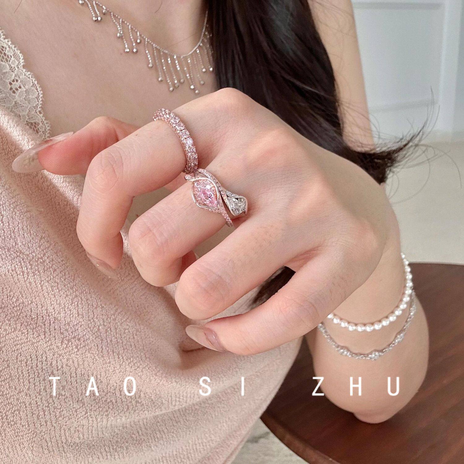 桃思竹 原创植物系粉色锆石马蹄莲森系轻奢高级感开口可调节指环