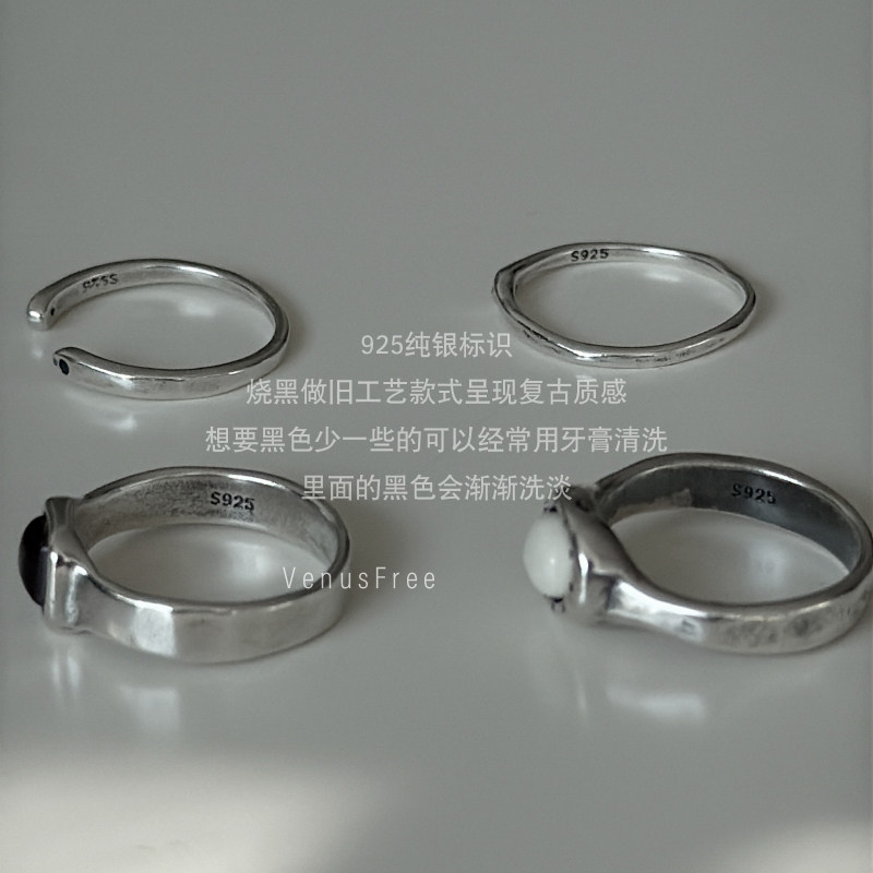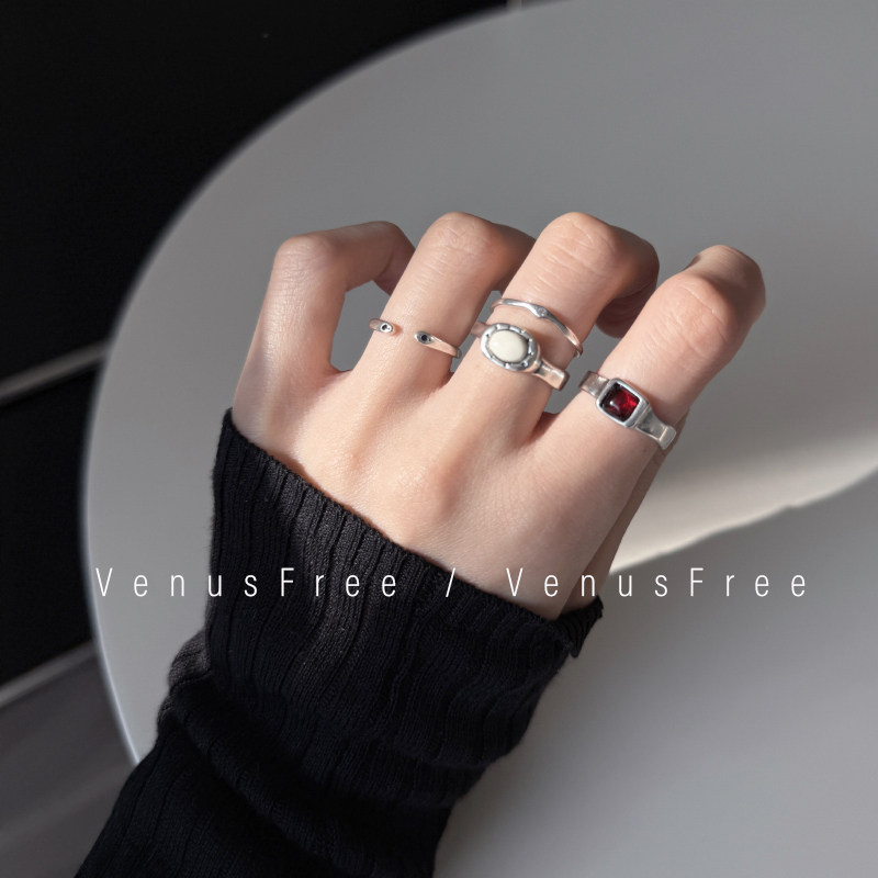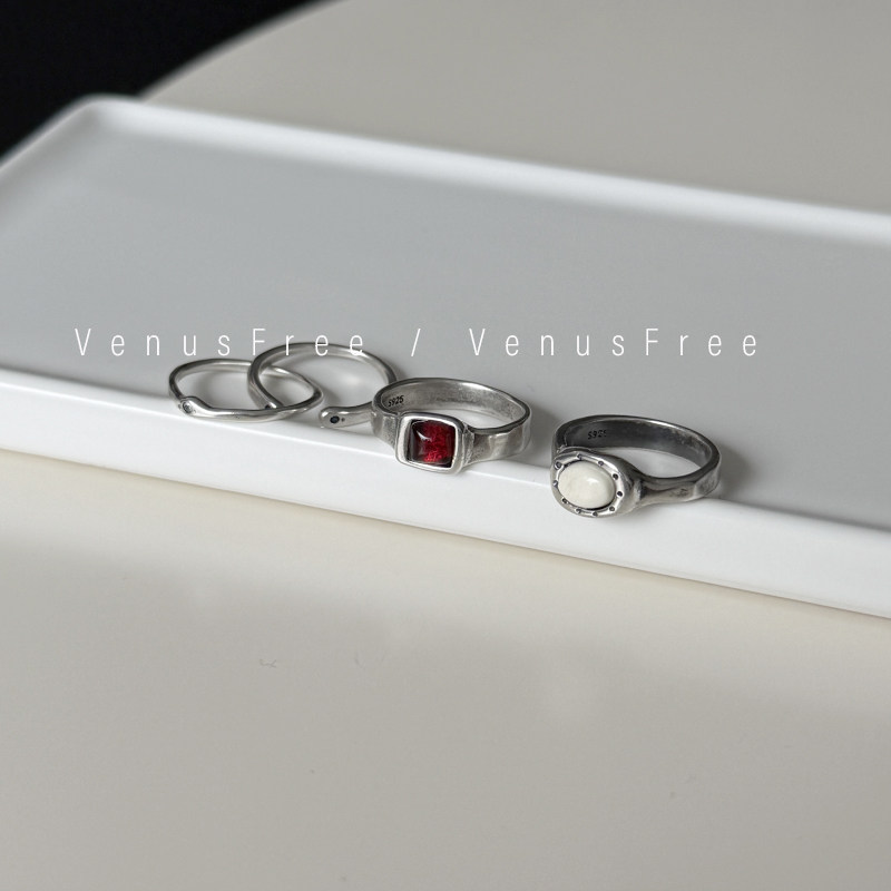 热红酒复古Vintage通体925纯银烧黑做旧酒红白色宝石极细小钻戒指