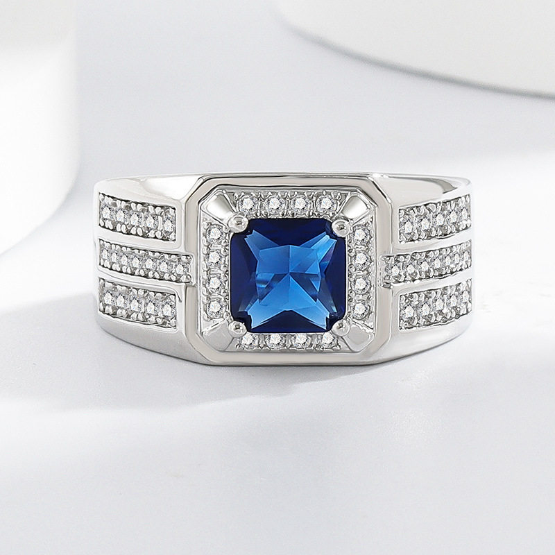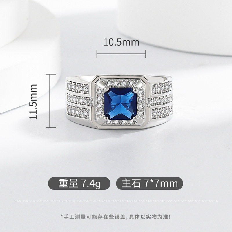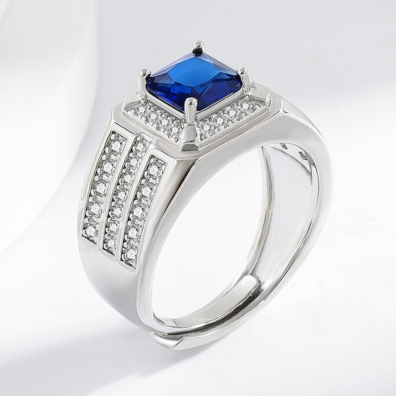 新款时尚霸气蓝色锆石开口男女款戒指镶嵌蓝色方钻