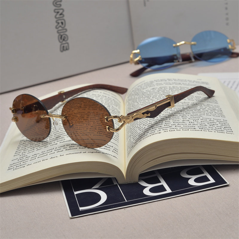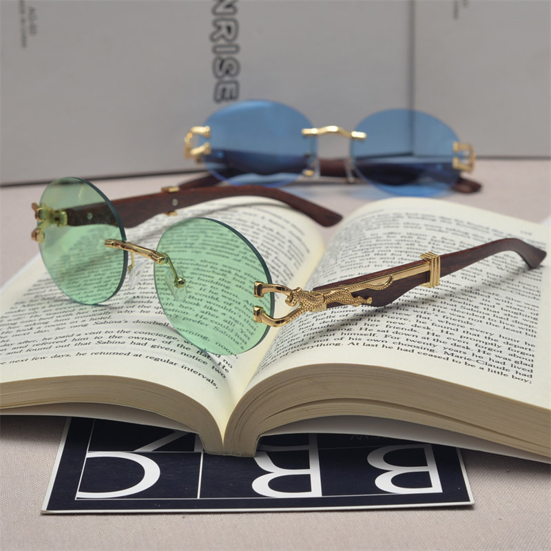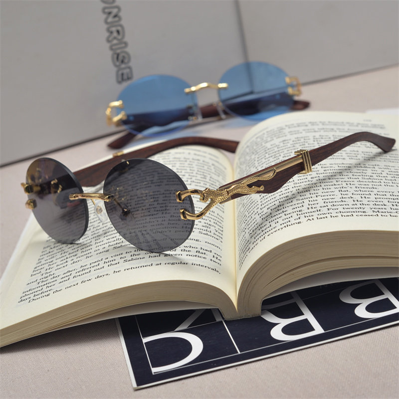欧美复古新款椭圆形无框切边墨镜男女潮网红小脸显瘦木纹太阳眼镜