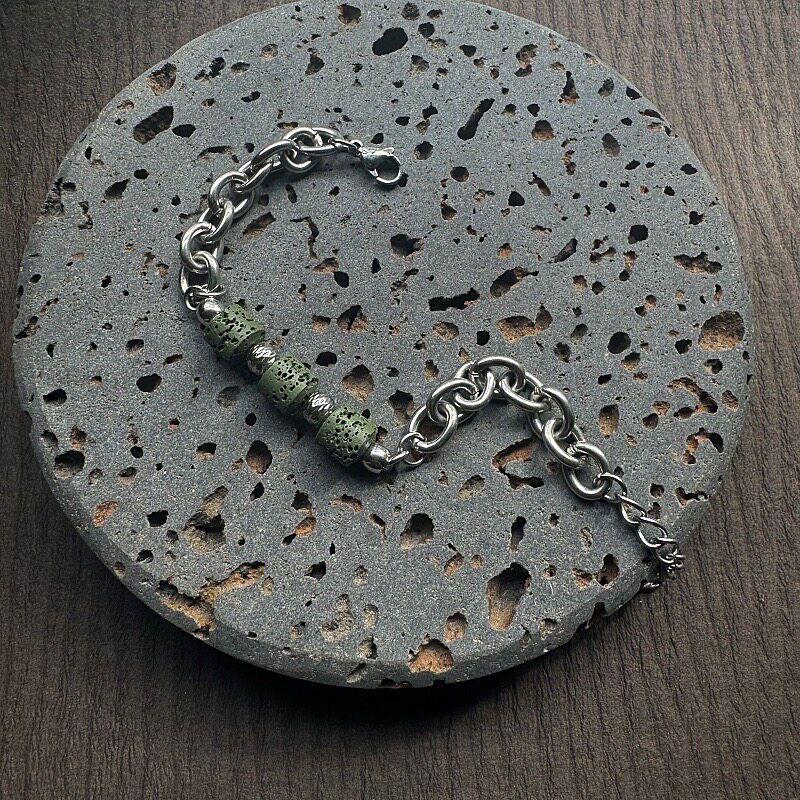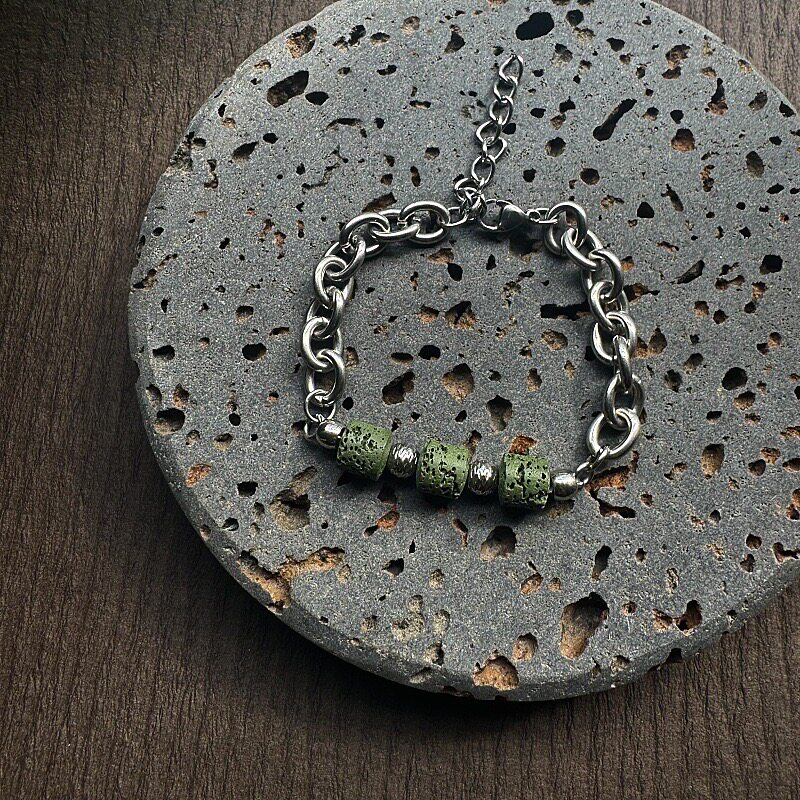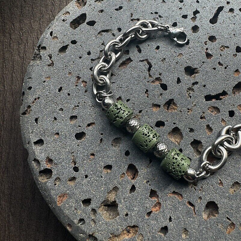 复古潮流手饰抹茶绿色火山石串珠手链男女通用个性不锈钢超酷嘻哈
