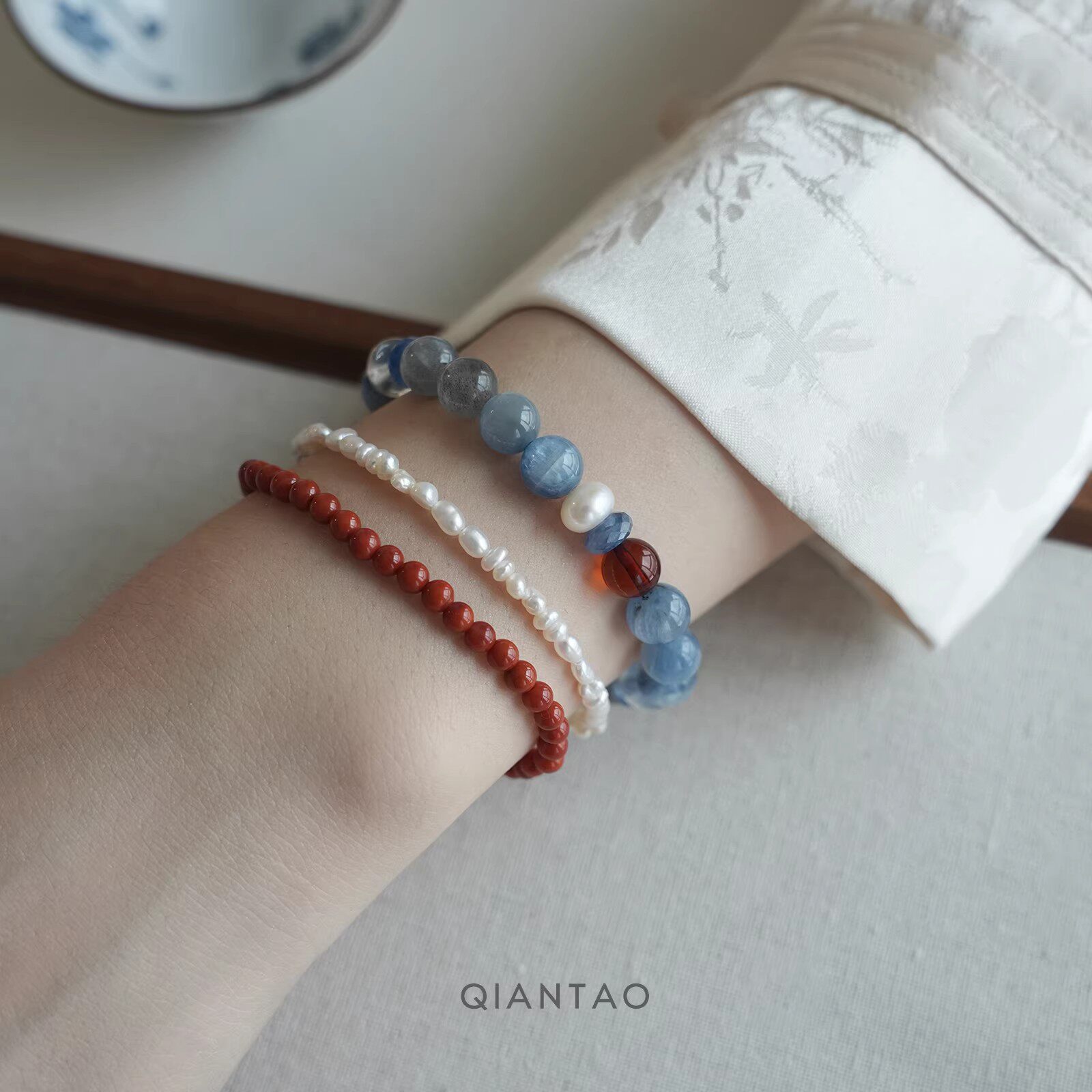新款百搭中式天然蓝晶石手链珍珠白水晶手串礼物淘宝新款水晶串珠