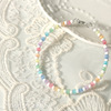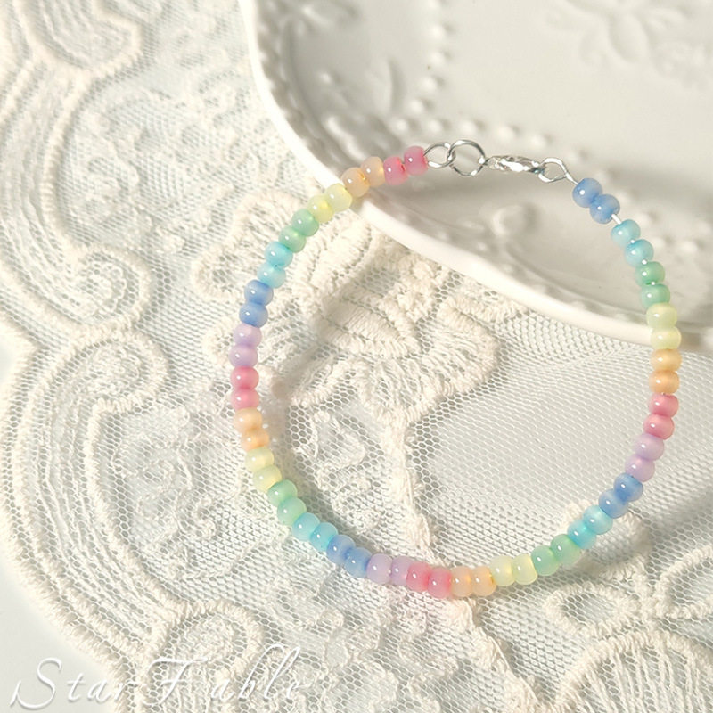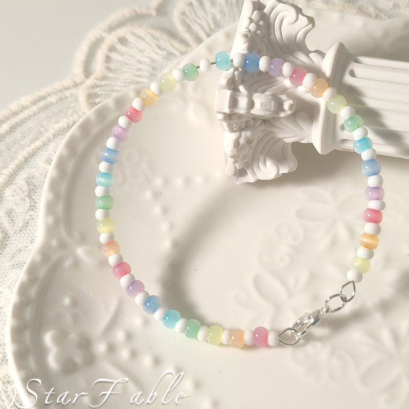 彩虹色串珠猫眼米珠手链女设计可爱原创记忆钢丝学生闺蜜手环简约