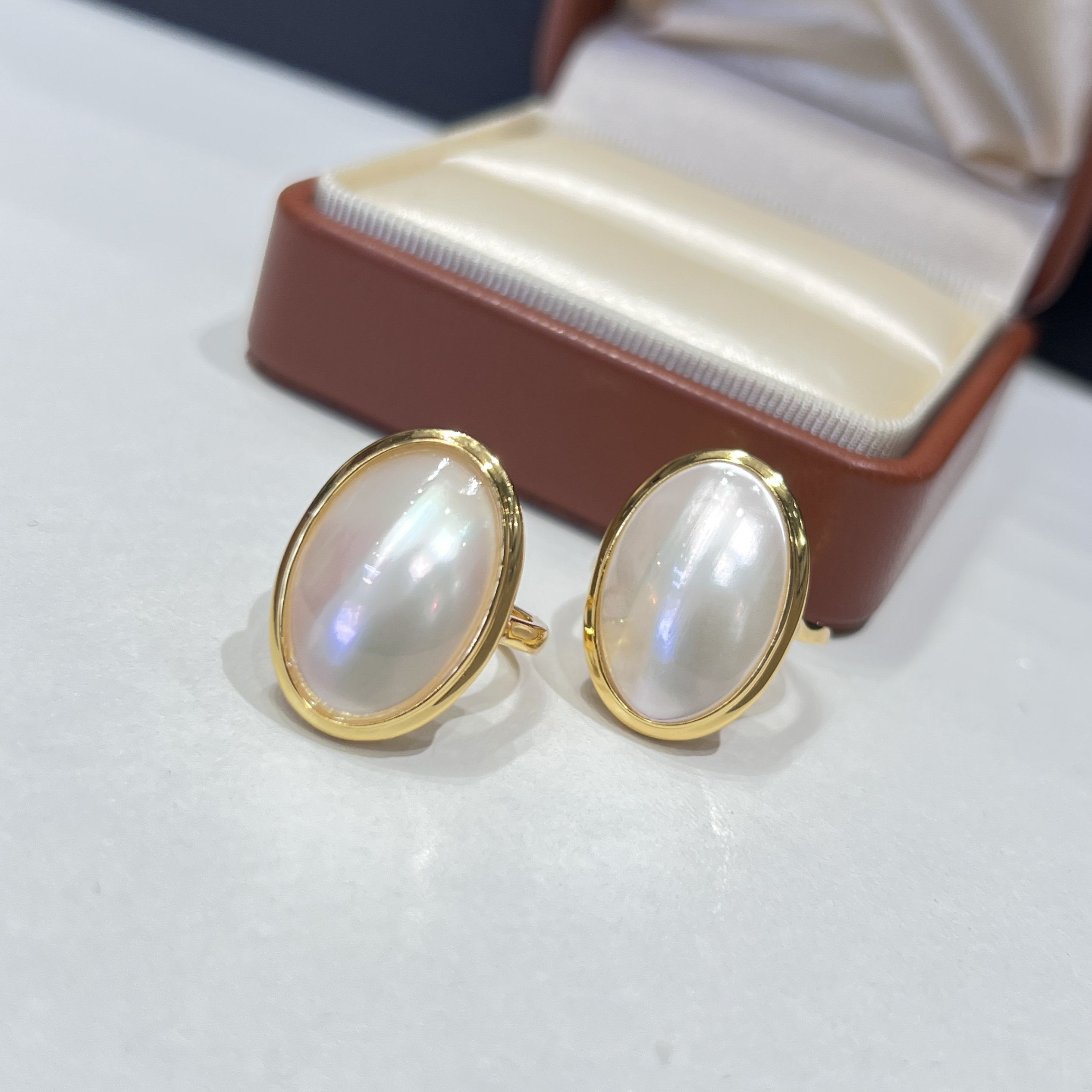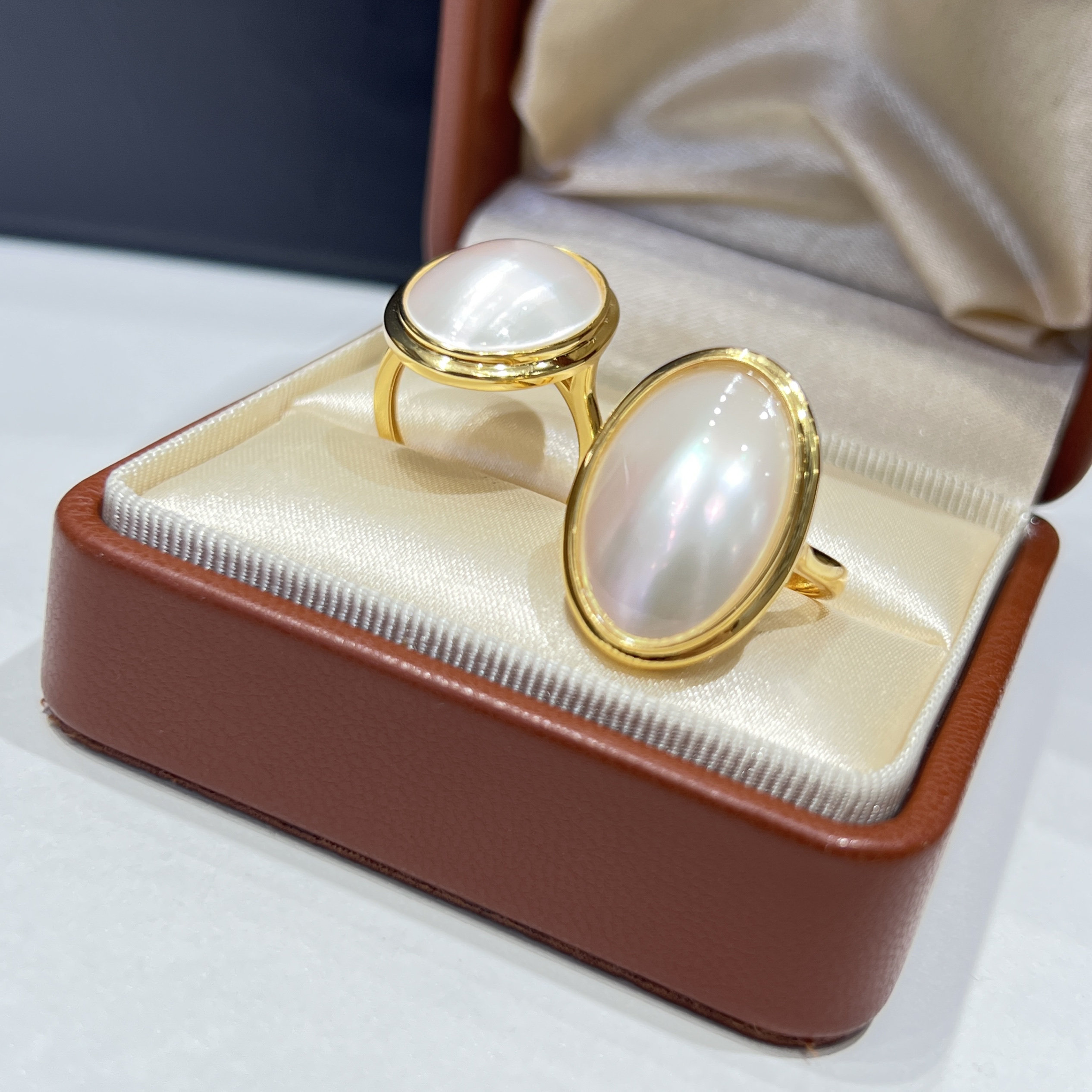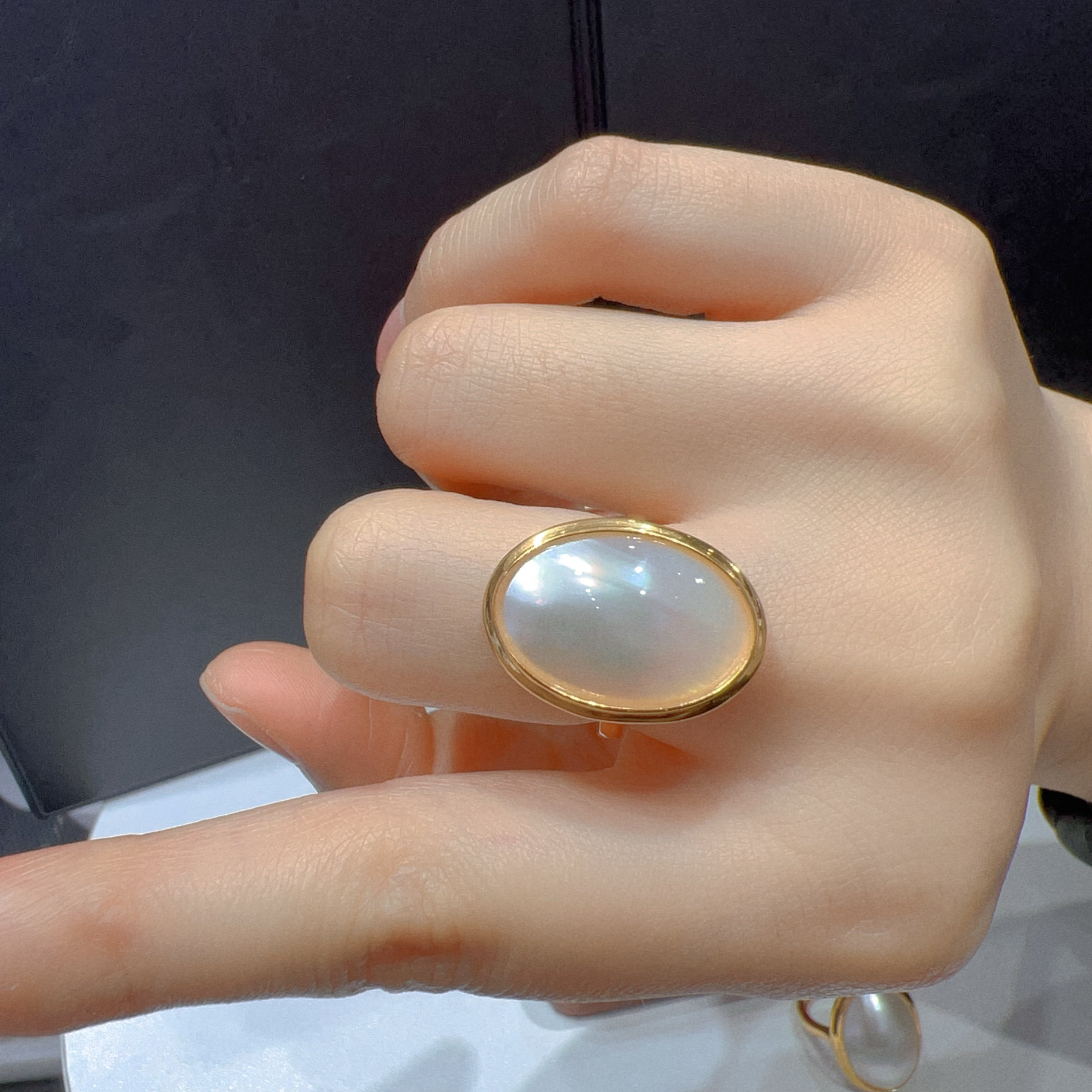 宇宙光环海水马贝S925银开口戒指椭圆白色微生长纹高亮质感厚银