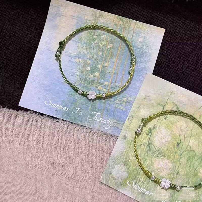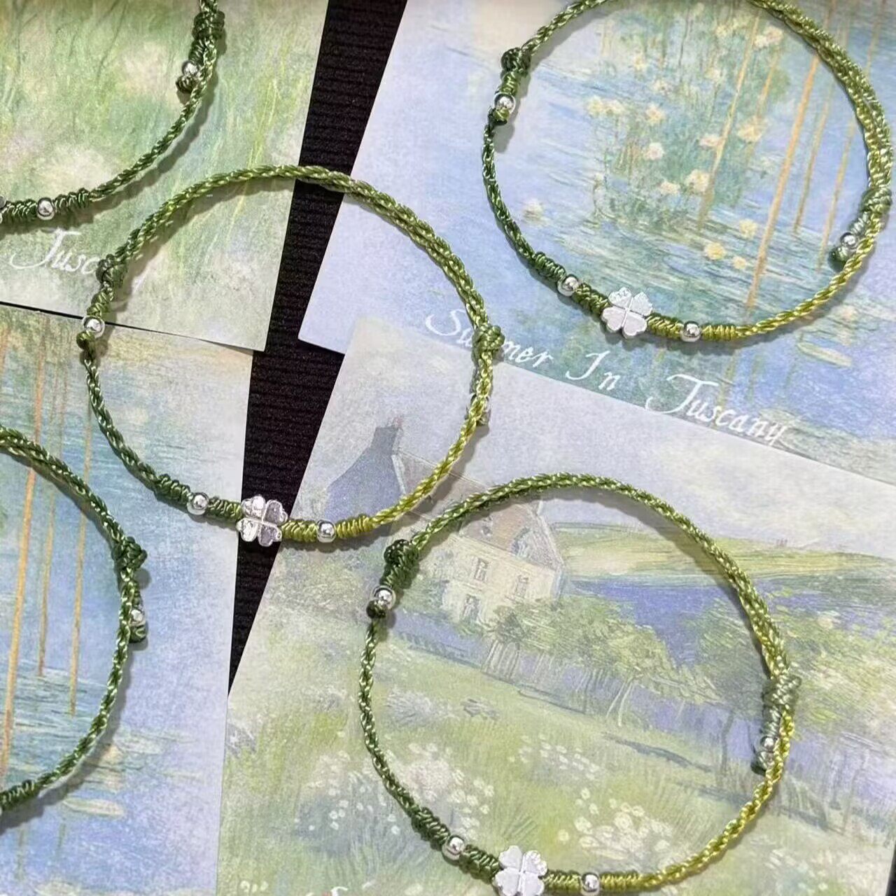 小红书爆款绿色四叶草小蝶蜡线编织手链女时尚显白设计百搭奢品一