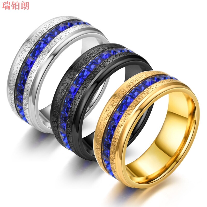 瑞铂朗韩版抖音创意学生朋克指环珍珠砂戒指蓝色炫目单排周圈方钻