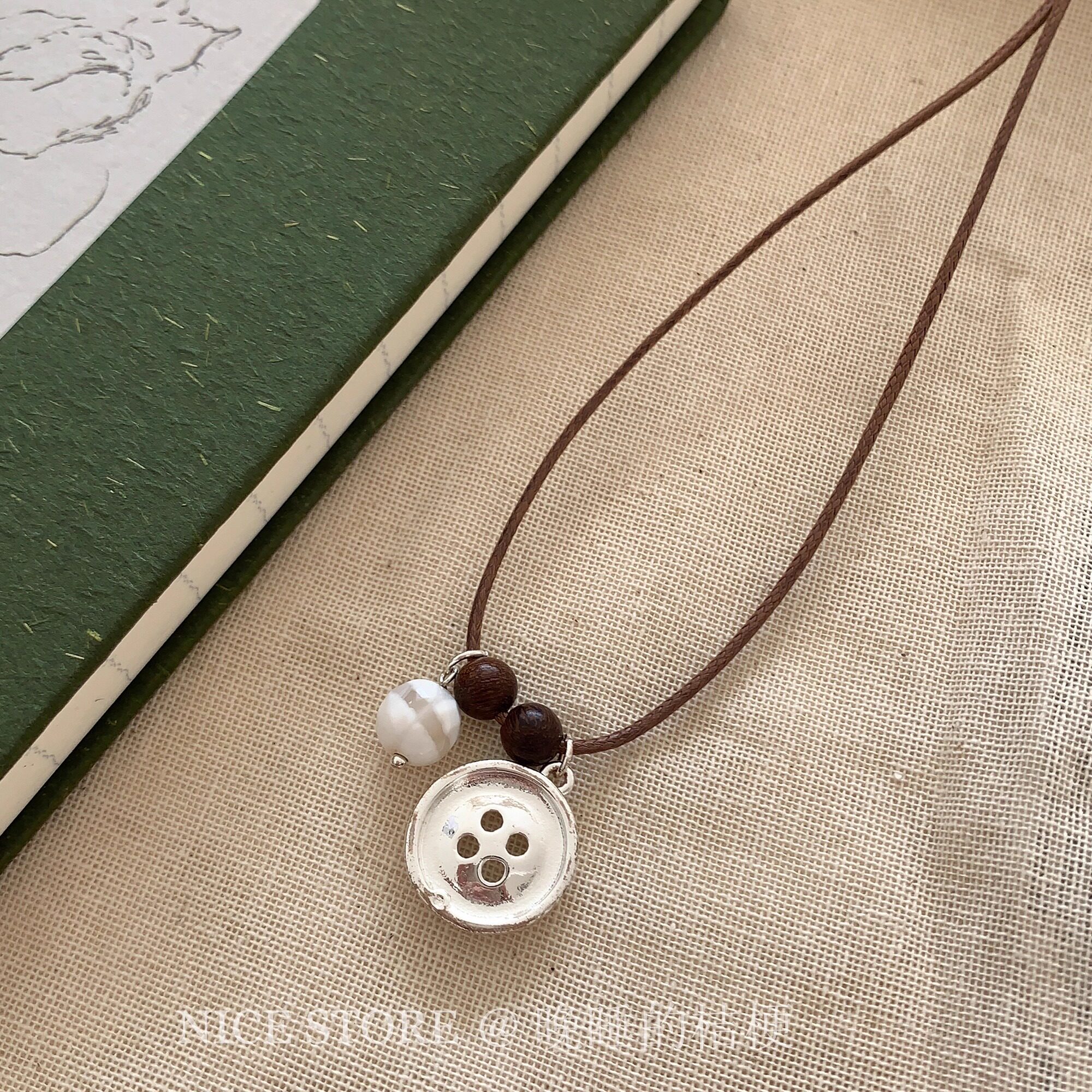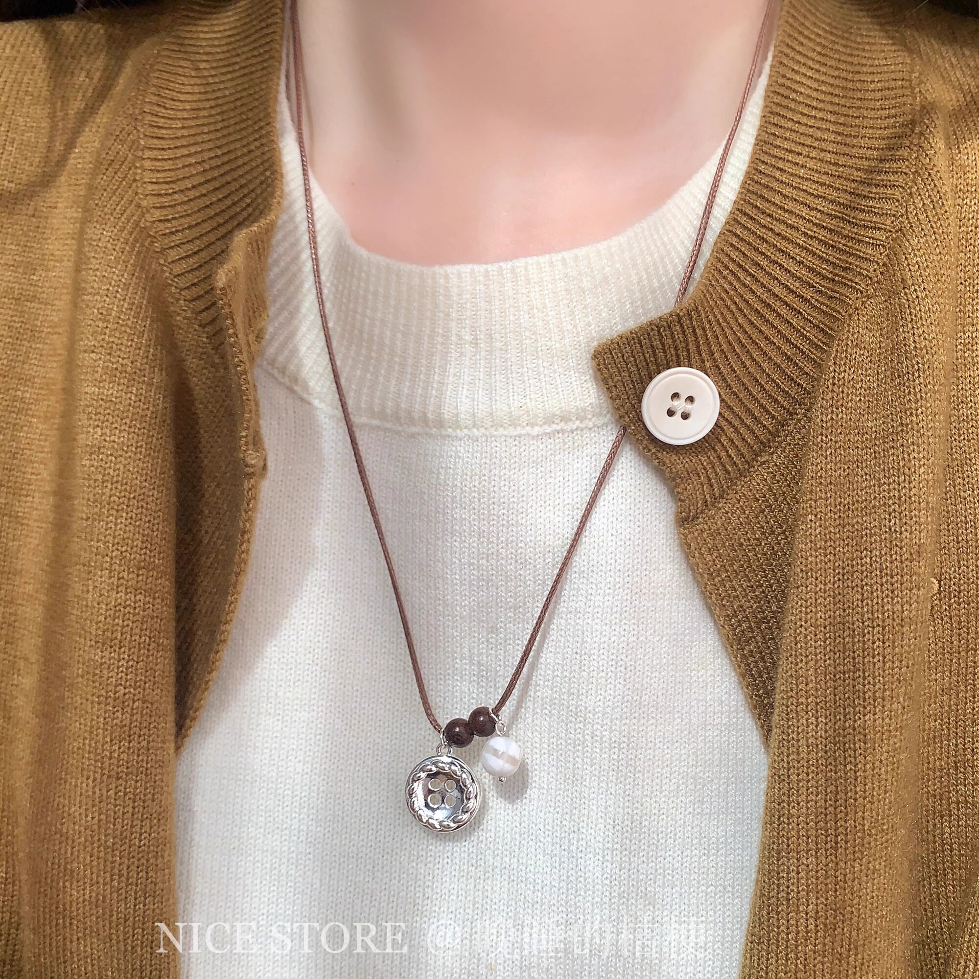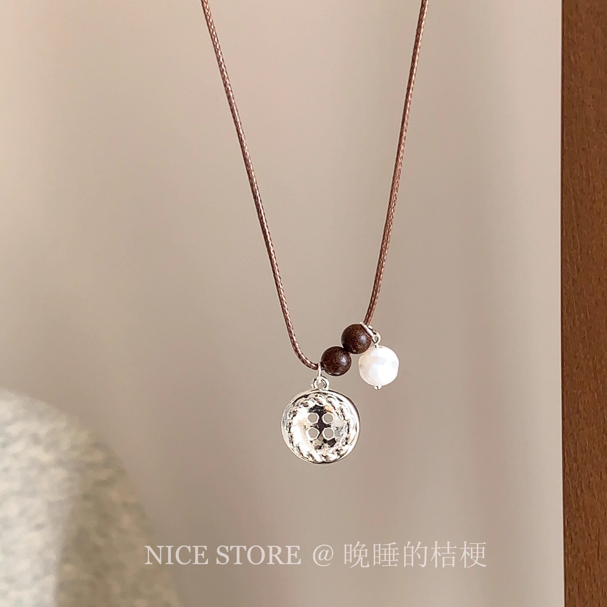 晚睡的桔梗「原声」韩系ins纽扣珍珠项链棕色银扣吊坠简约毛衣链
