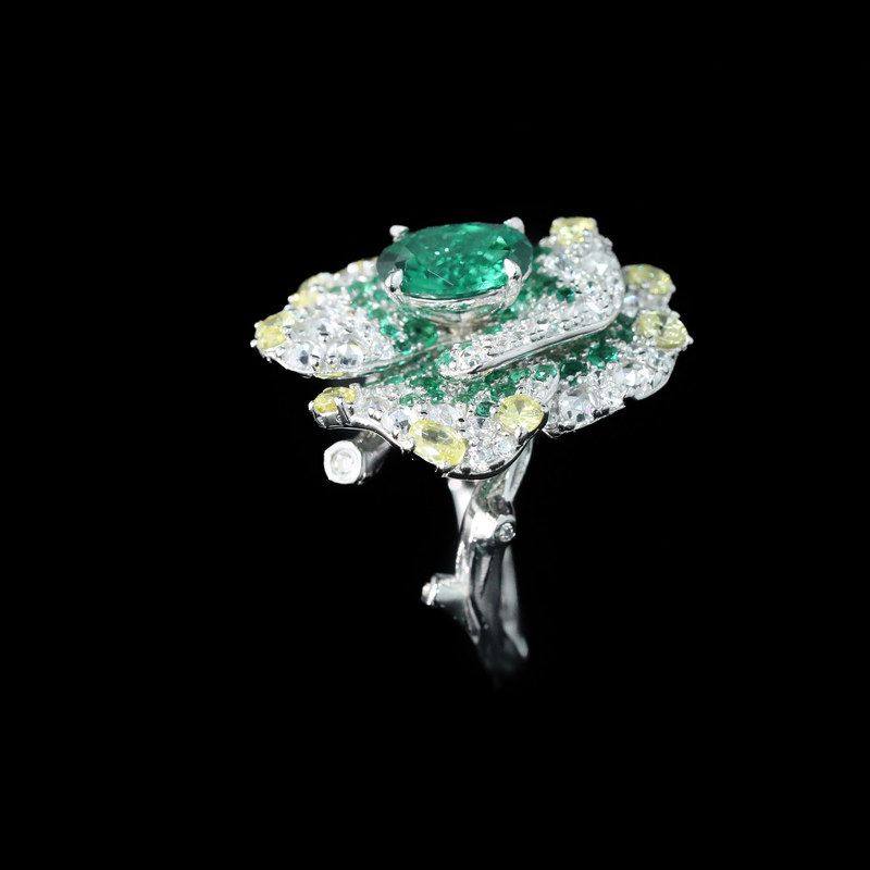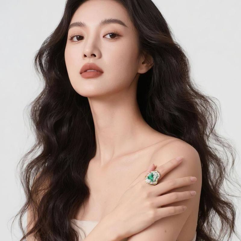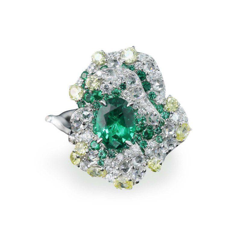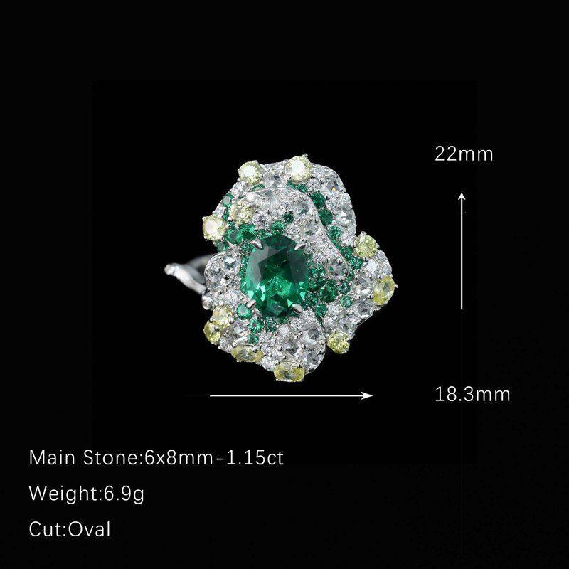 XBK/鑫葆康艺术银椭圆钻祖母绿设计师莫奈花园925切高碳镀金戒指