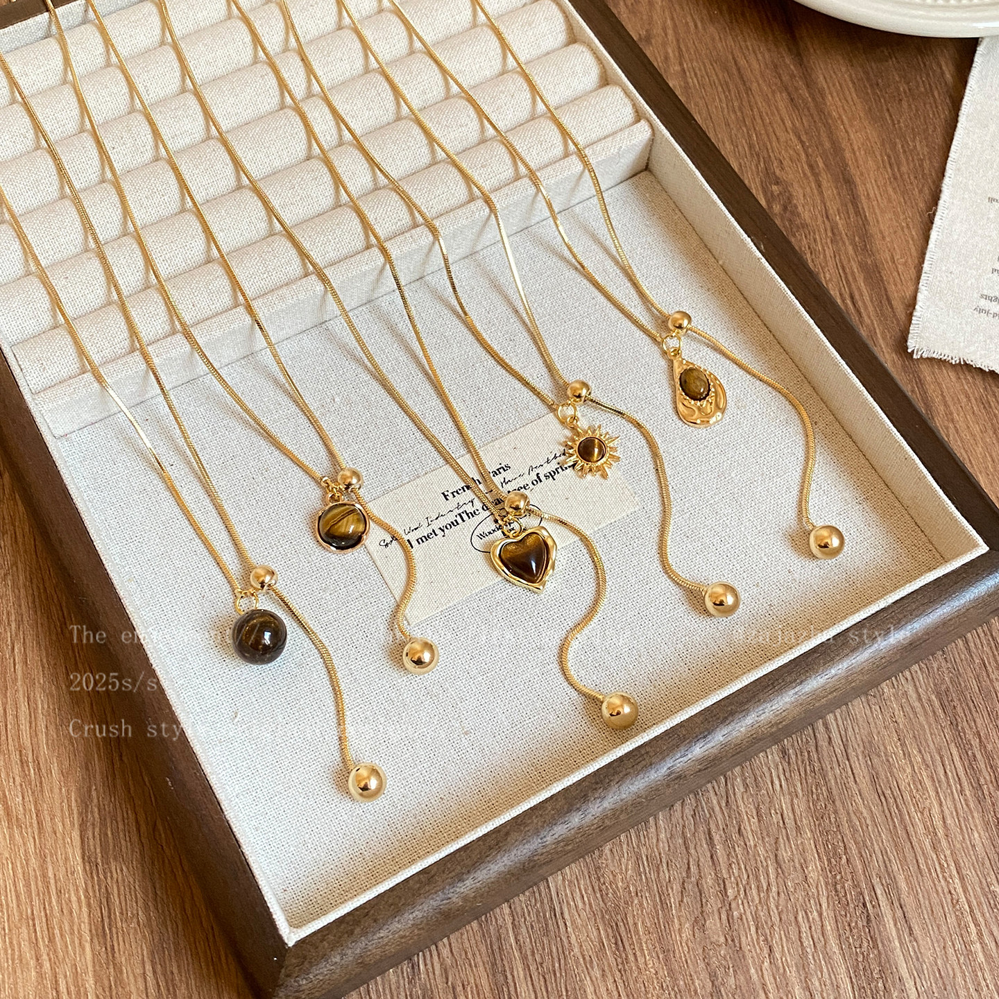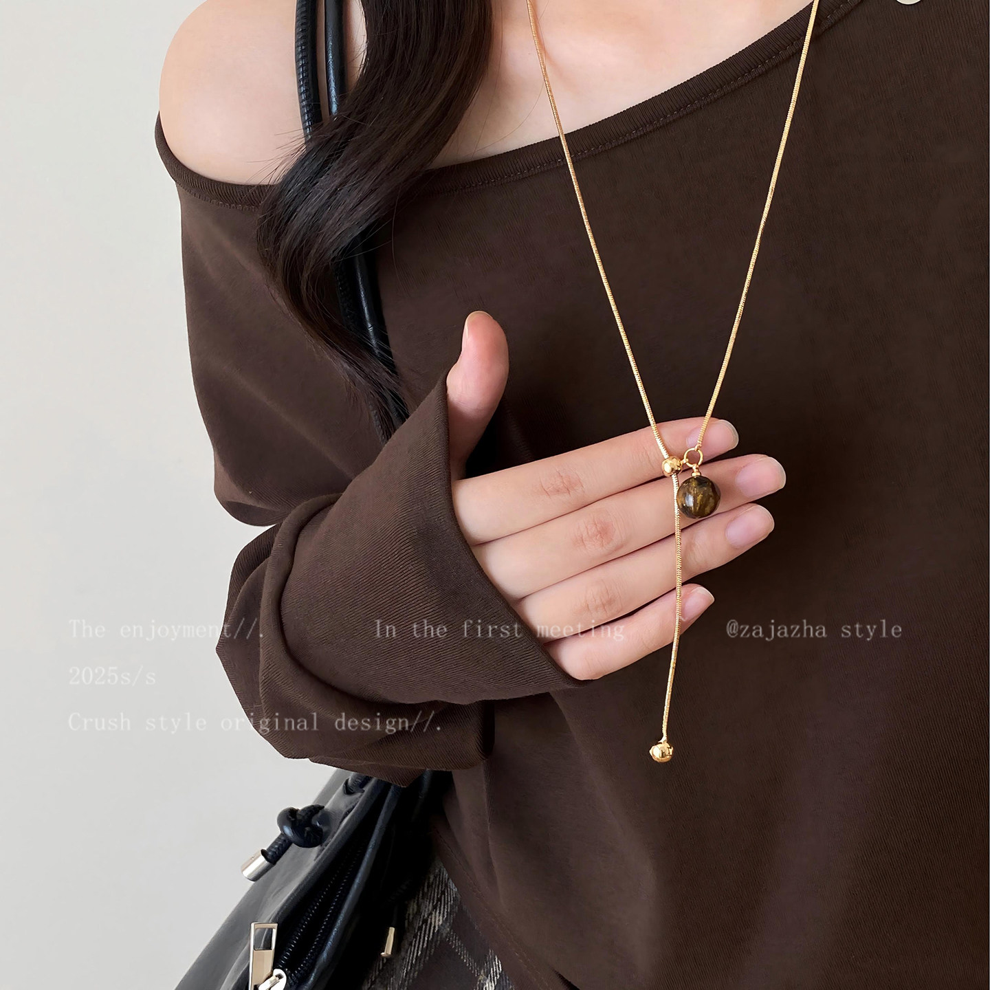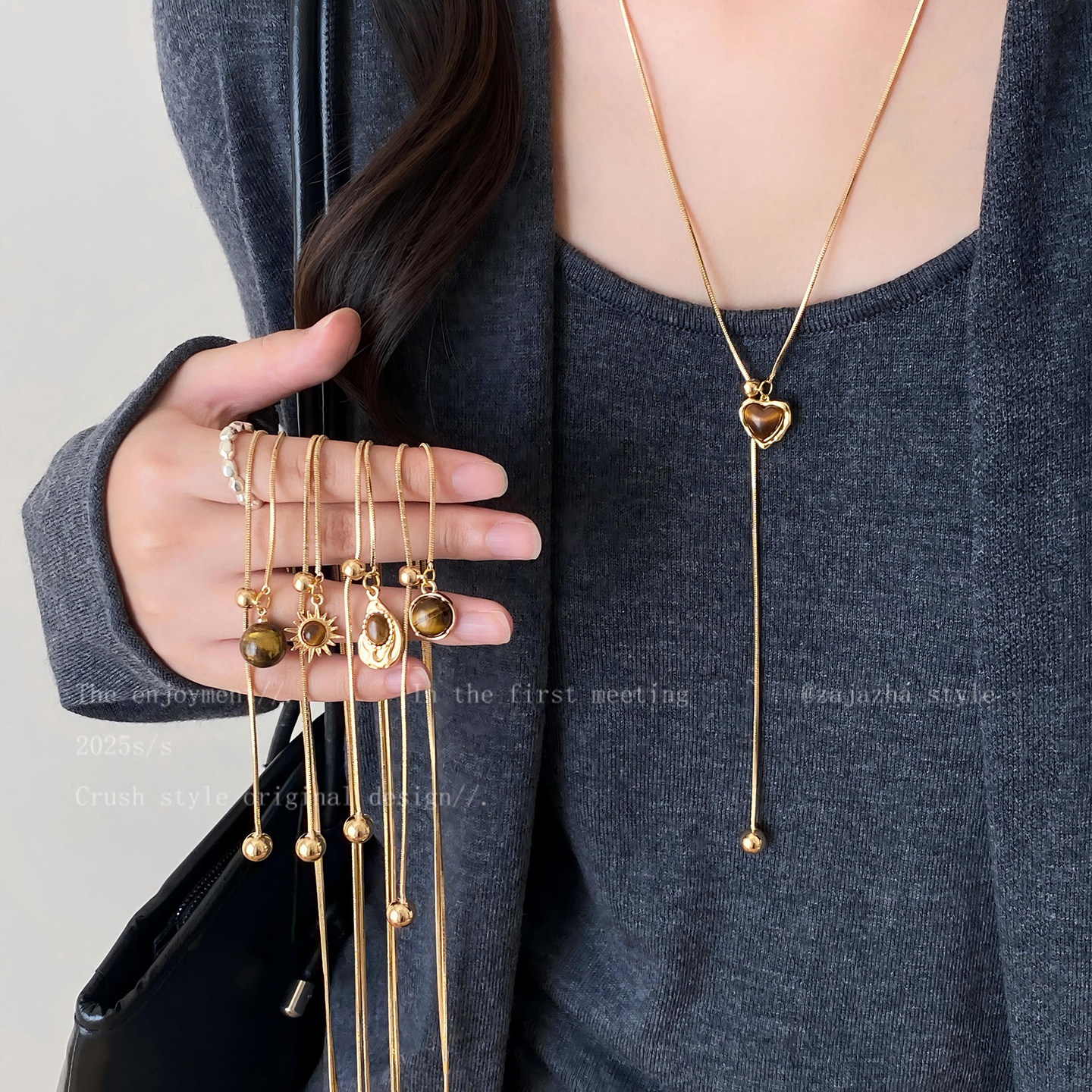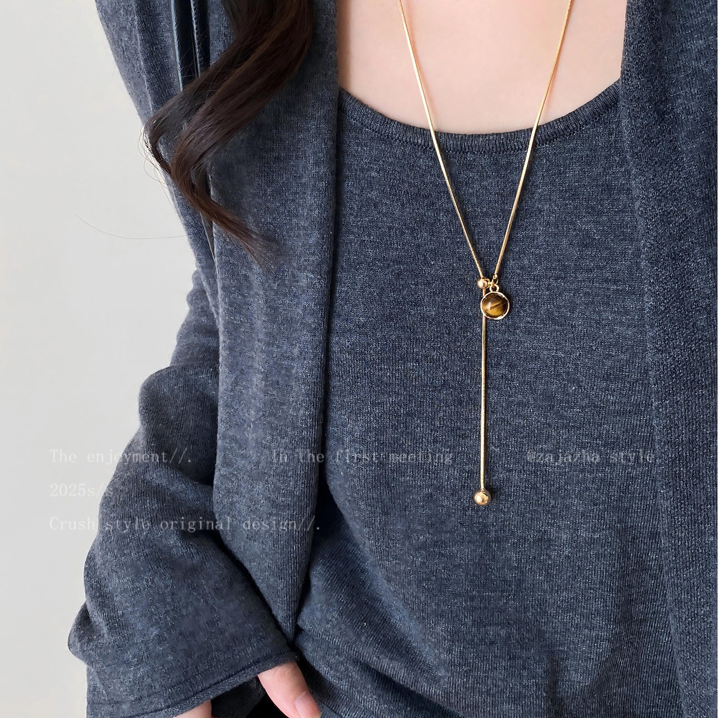 金色虎眼石吊坠抽拉项链女秋冬轻奢小众高级感长款毛衣链装饰配饰