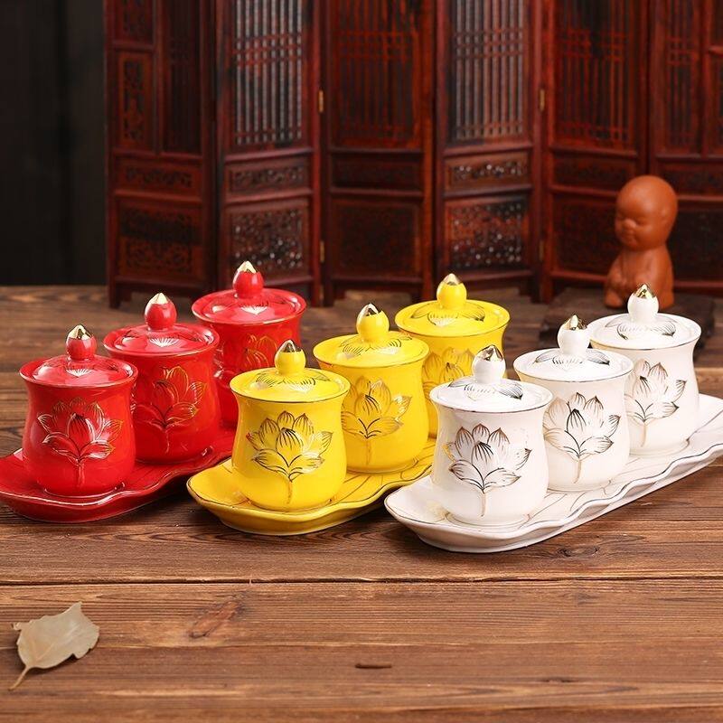 家用带盖佛前水杯陶瓷白色莲花供水专用杯佛堂供观音水杯净水杯