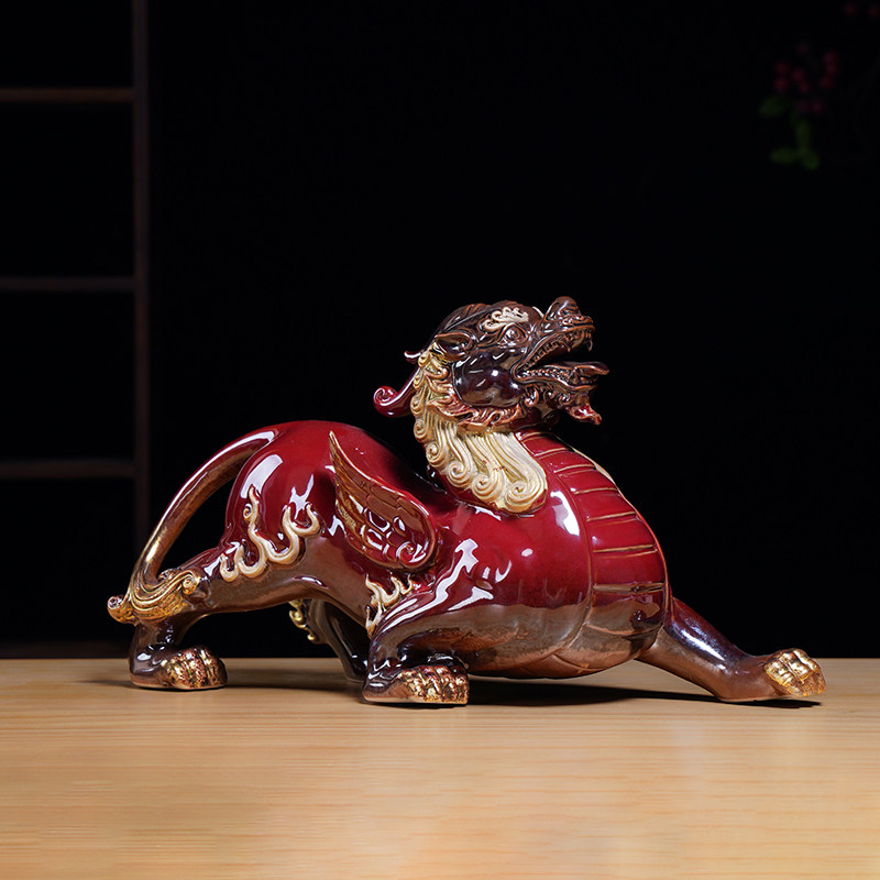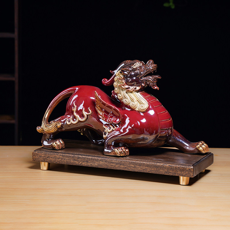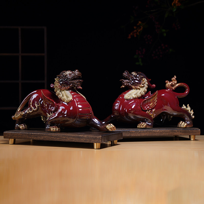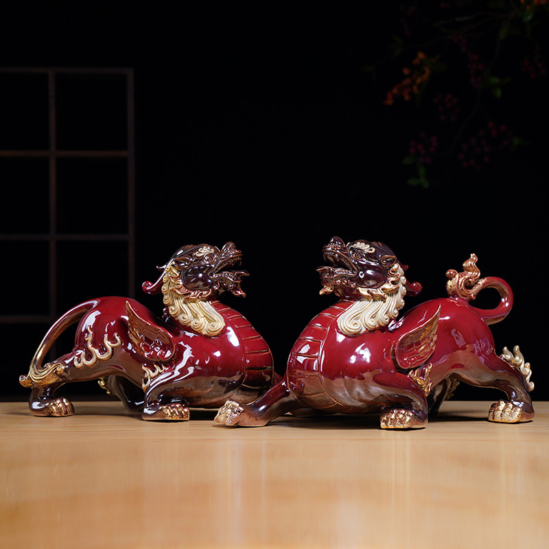 中式陶瓷招财貔貅摆件一对红色客厅玄关办公室桌面装饰开业礼品