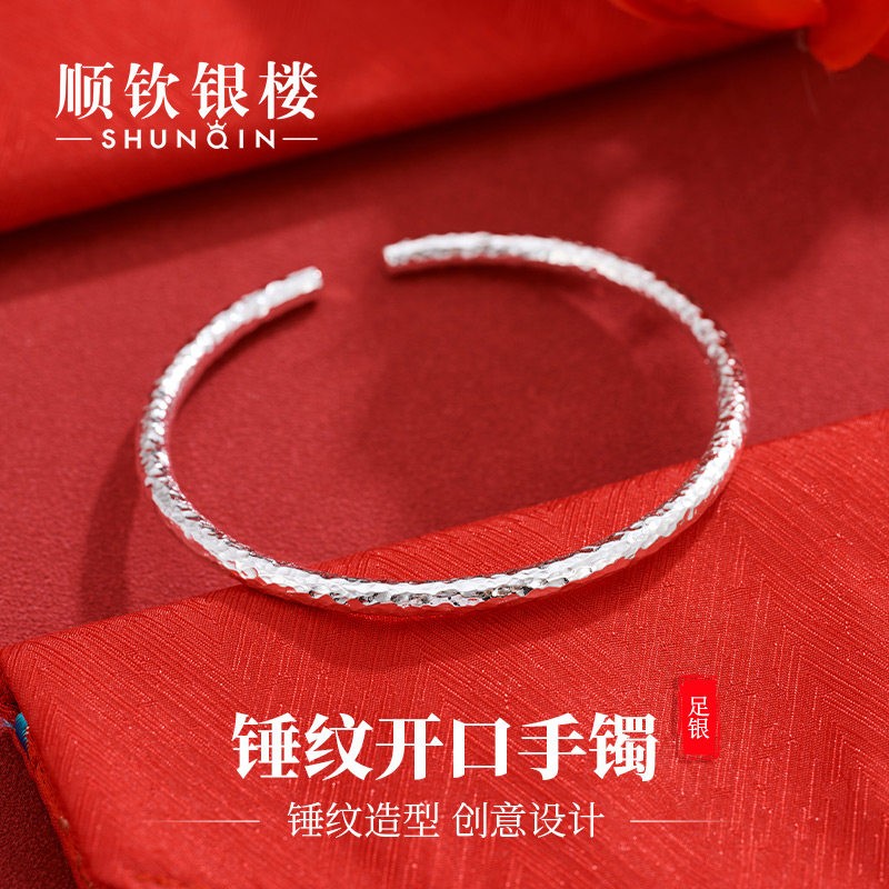 顺钦银楼S9999手工雪花银手镯锤纹足银镯子纯银手环小众银手饰