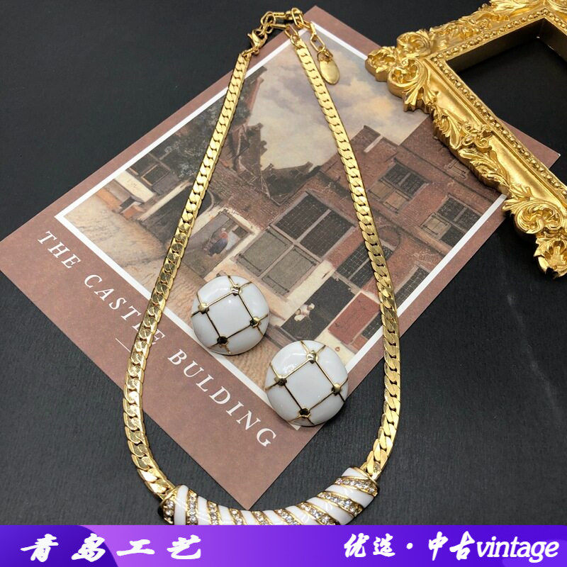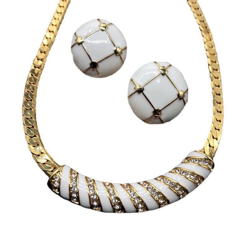 复古经典白色珐琅釉耳钉项链镀真金镶宝石钻铜链项链耳钉耳夹套装