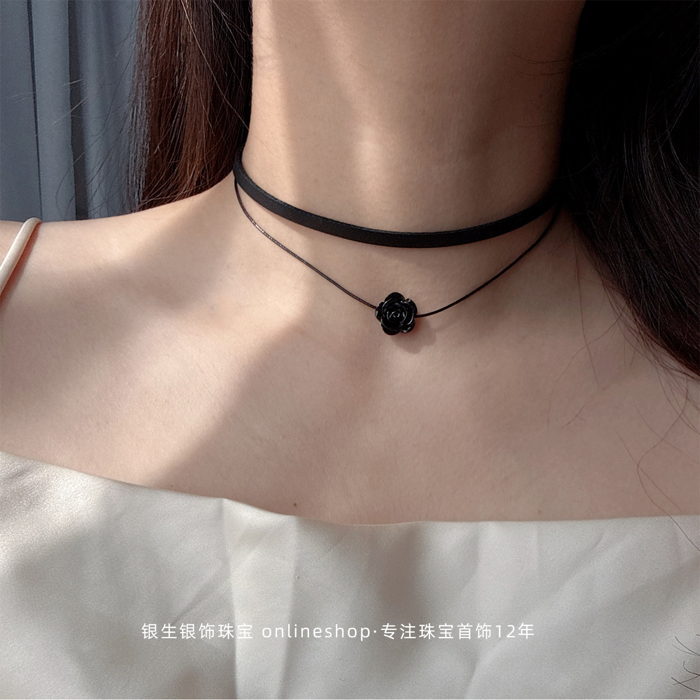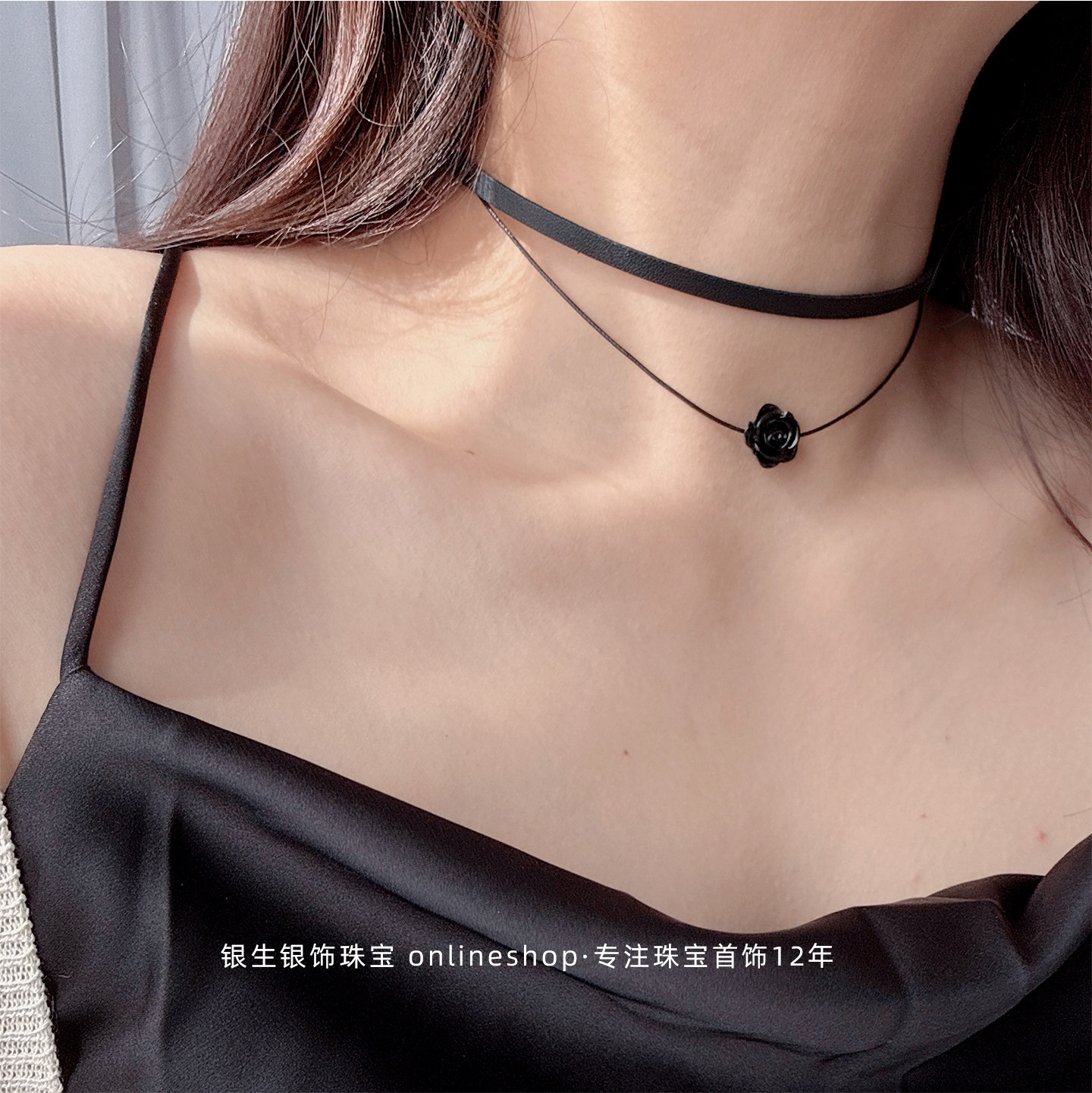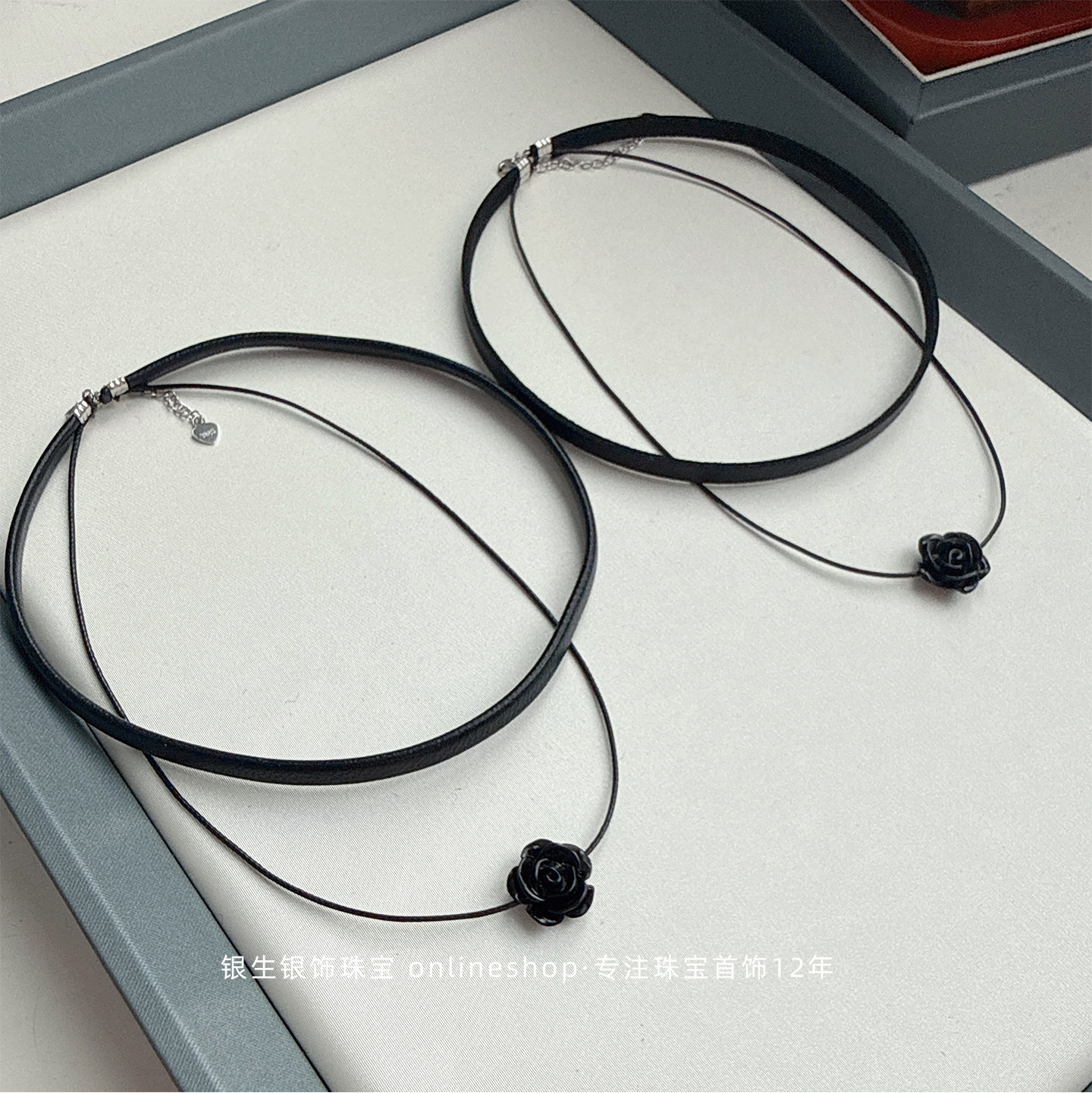 高级感S925纯银黑色山茶花颈链双层皮绳项圈玫瑰花项链女款choker