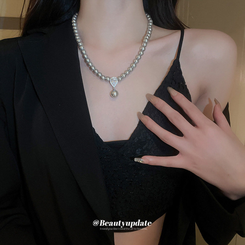 施家珍珠锆石吊坠水滴项链复古百搭轻奢毛衣链气质高级感简约饰品