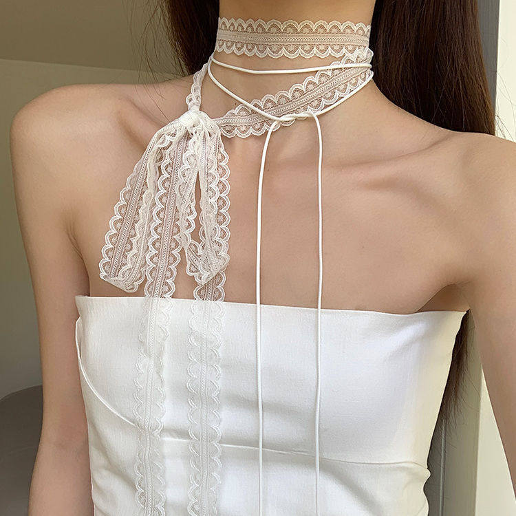 叠戴层次感白色蕾丝系脖锁骨颈带女小众细窄长条飘带丝巾项链花边