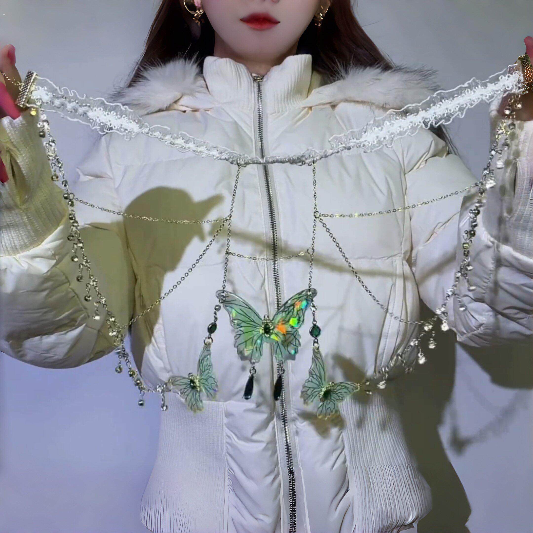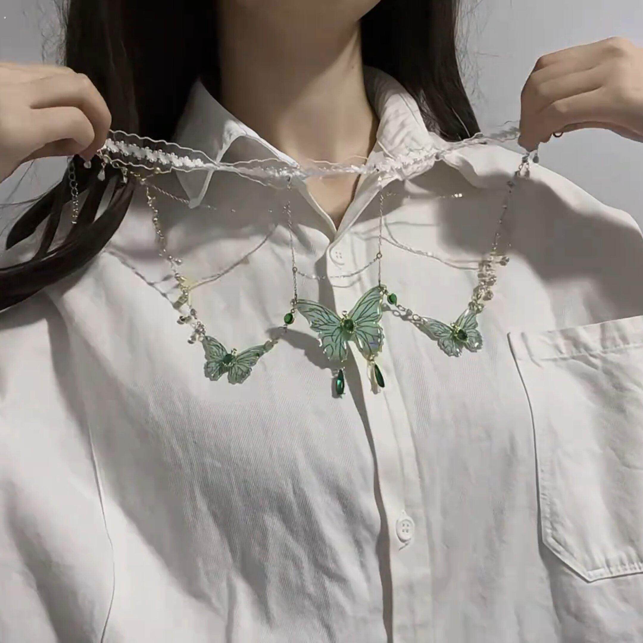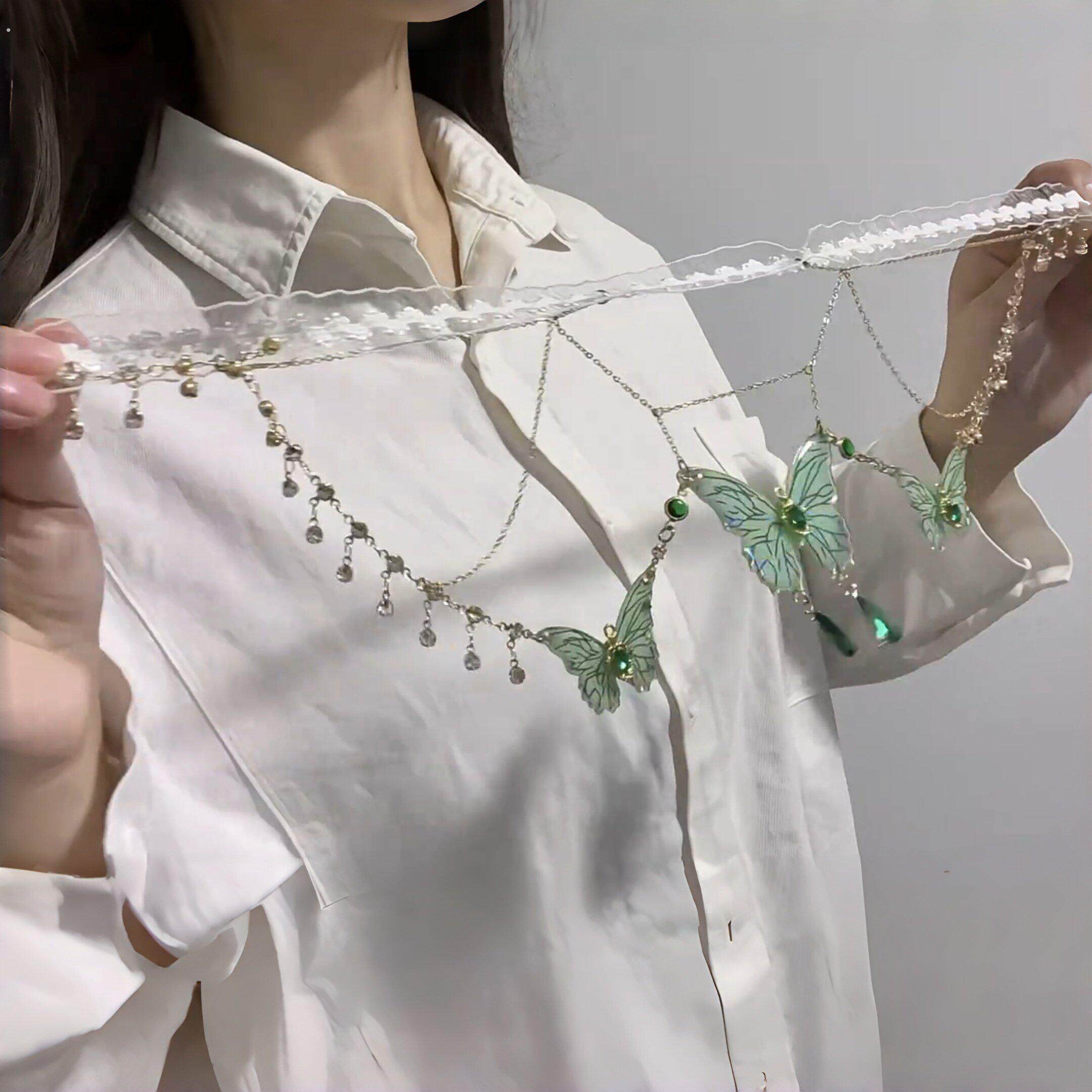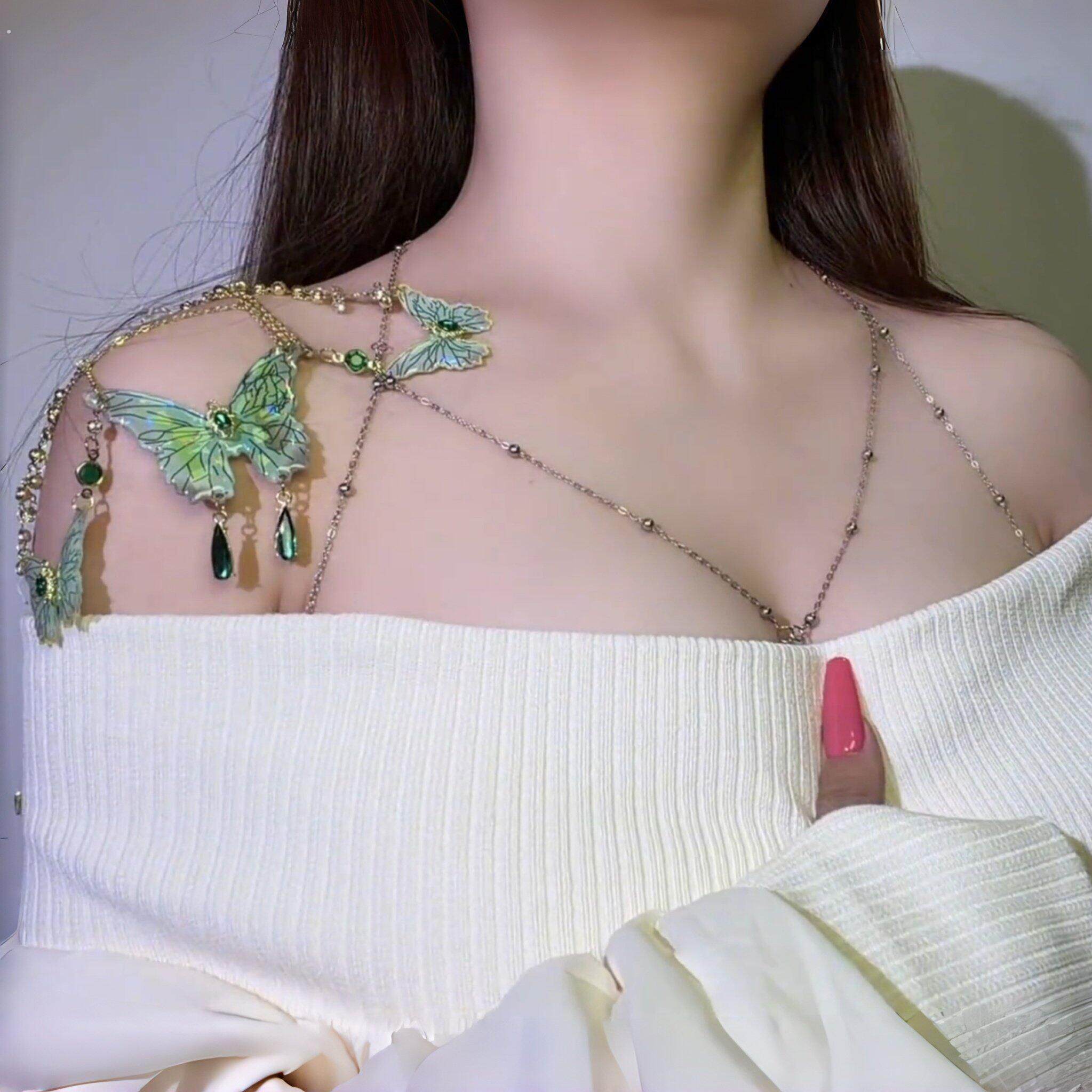 蕾丝绿色蝴蝶流苏项链仙气小众腿环女森系纯欲腿链性感辣妹身体链