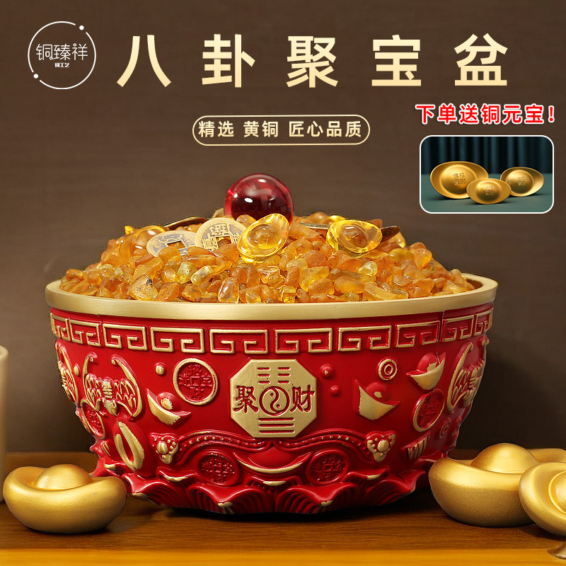 黄铜红色聚宝盆招财聚财铜缸纯黄铜米缸水晶摆件结婚送新人礼品