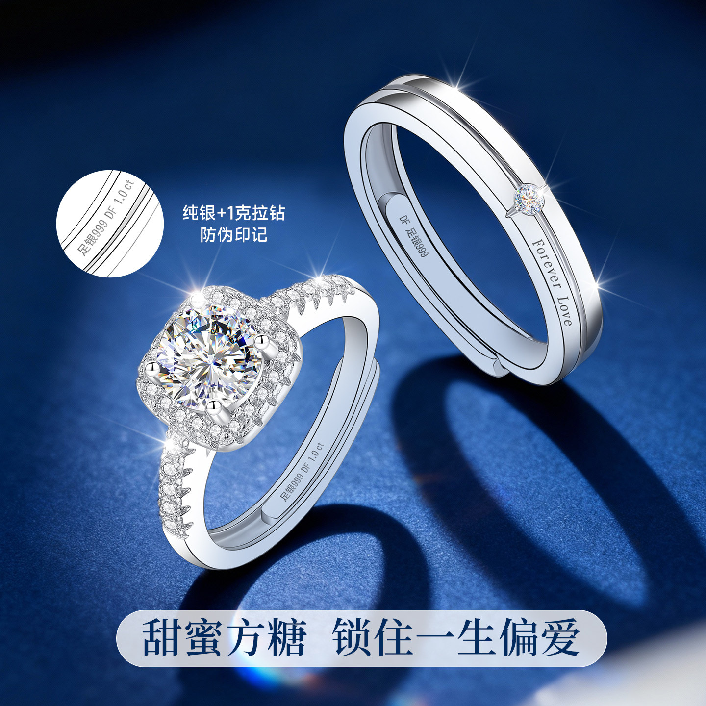 999纯银方糖小情侣对戒情侣款一对999足银戒指莫桑石钻戒2026新款