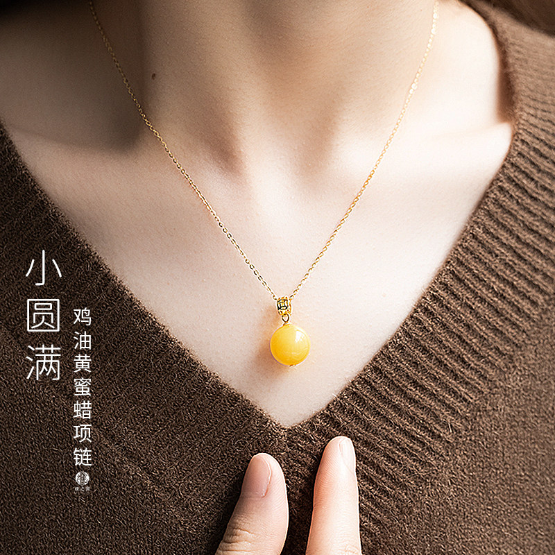 蜜蜡吊坠天然琥珀鸡油黄色925纯银项链简约复古圆珠锁骨链女蜜媱