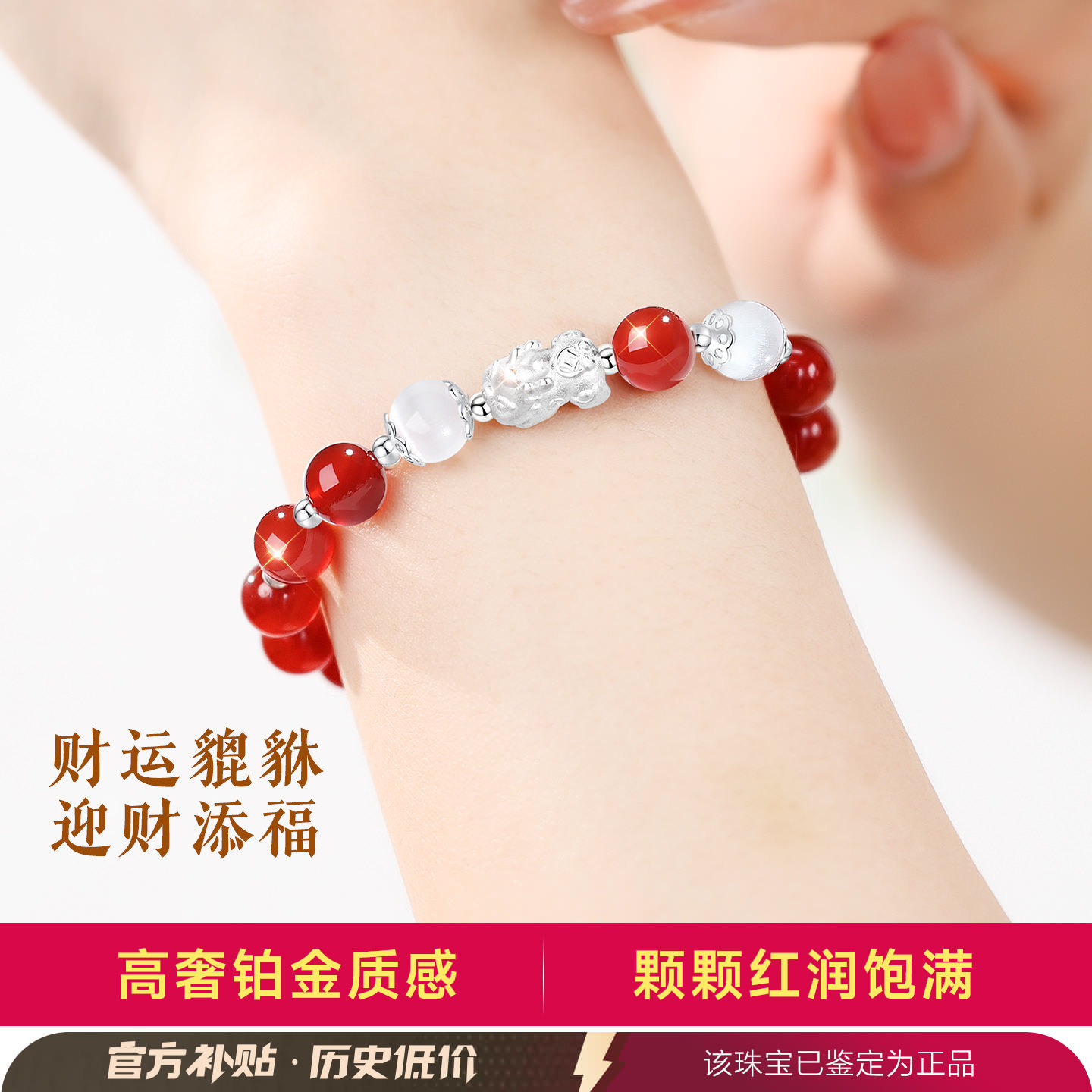 天然红玛瑙手串女纯银貔貅手链女款女士红色串珠手镯生日礼物女生