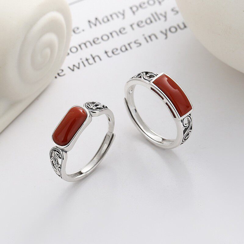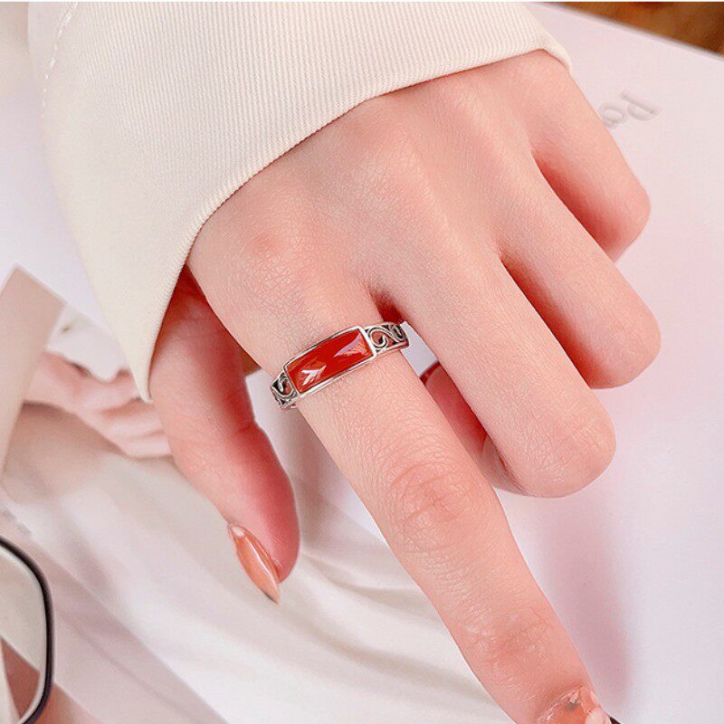 银创意树叶镂空造型戒托红色长方形锆石民族风开口戒指饰品