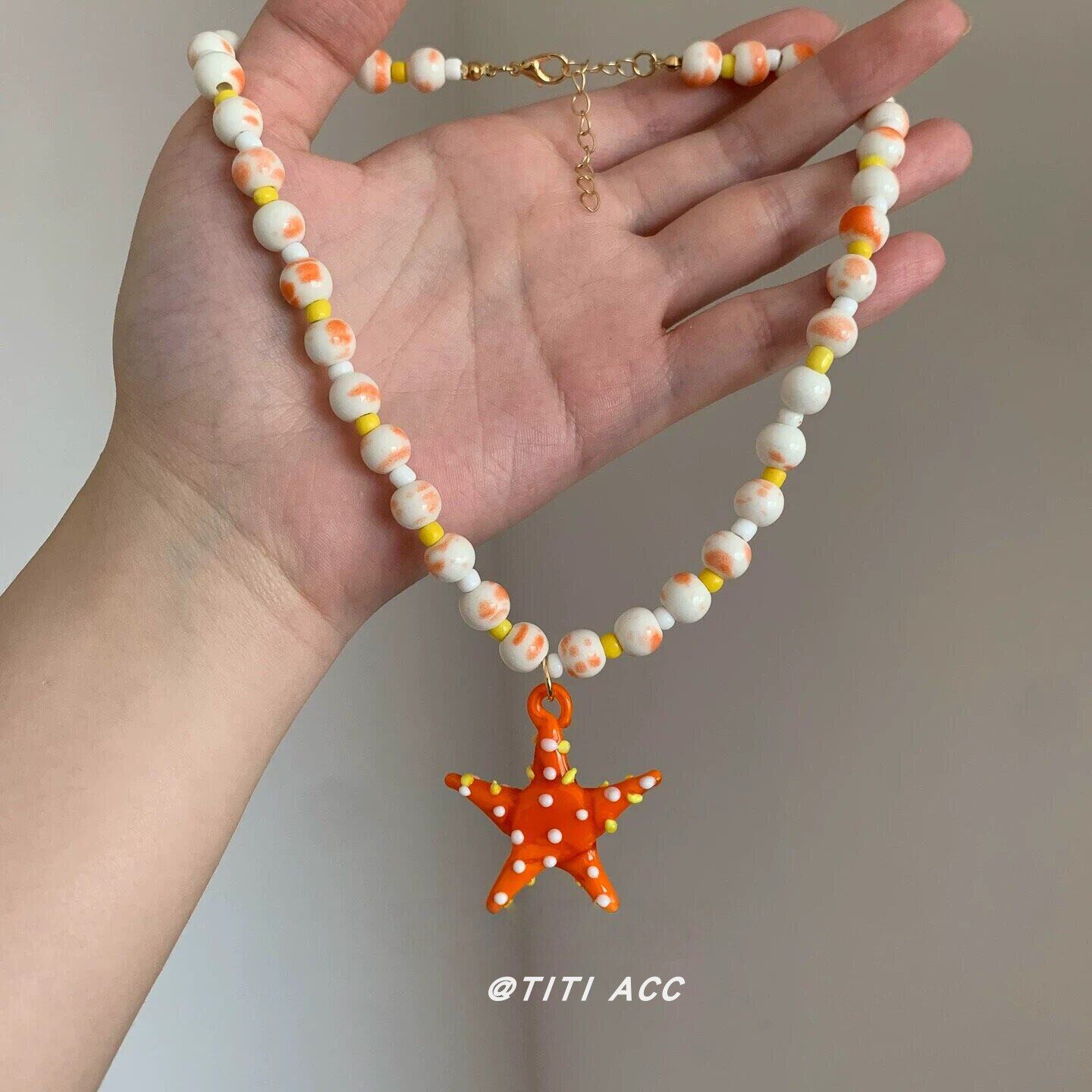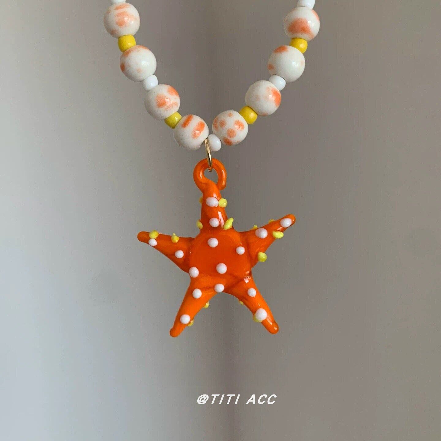 波西米亚度假风橙色海星吊坠串珠项链女复古高级感显白锁骨链配饰