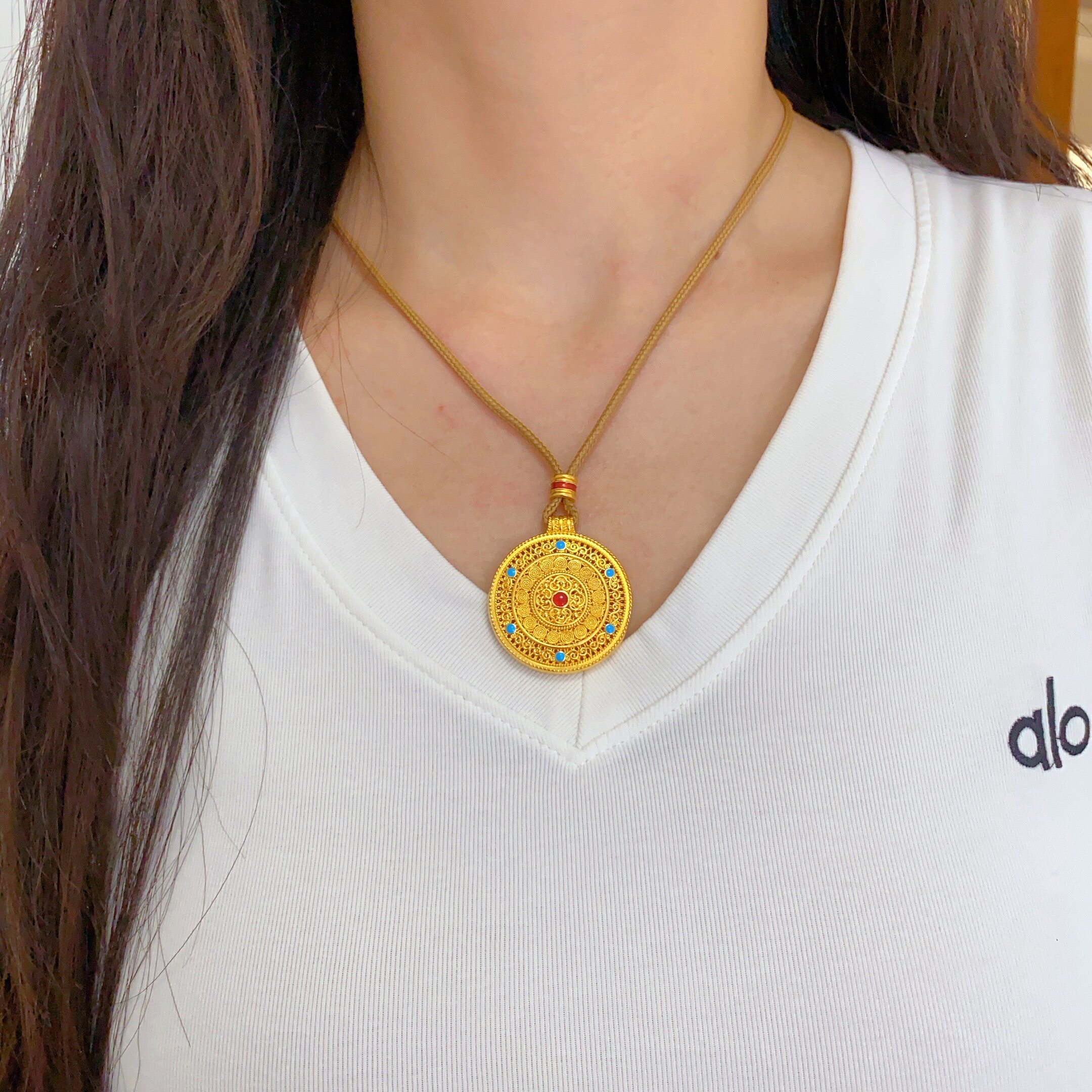 黄金包银吊坠八宝罗盘毛衣链女款复古如意圆满吊坠精致节日礼物