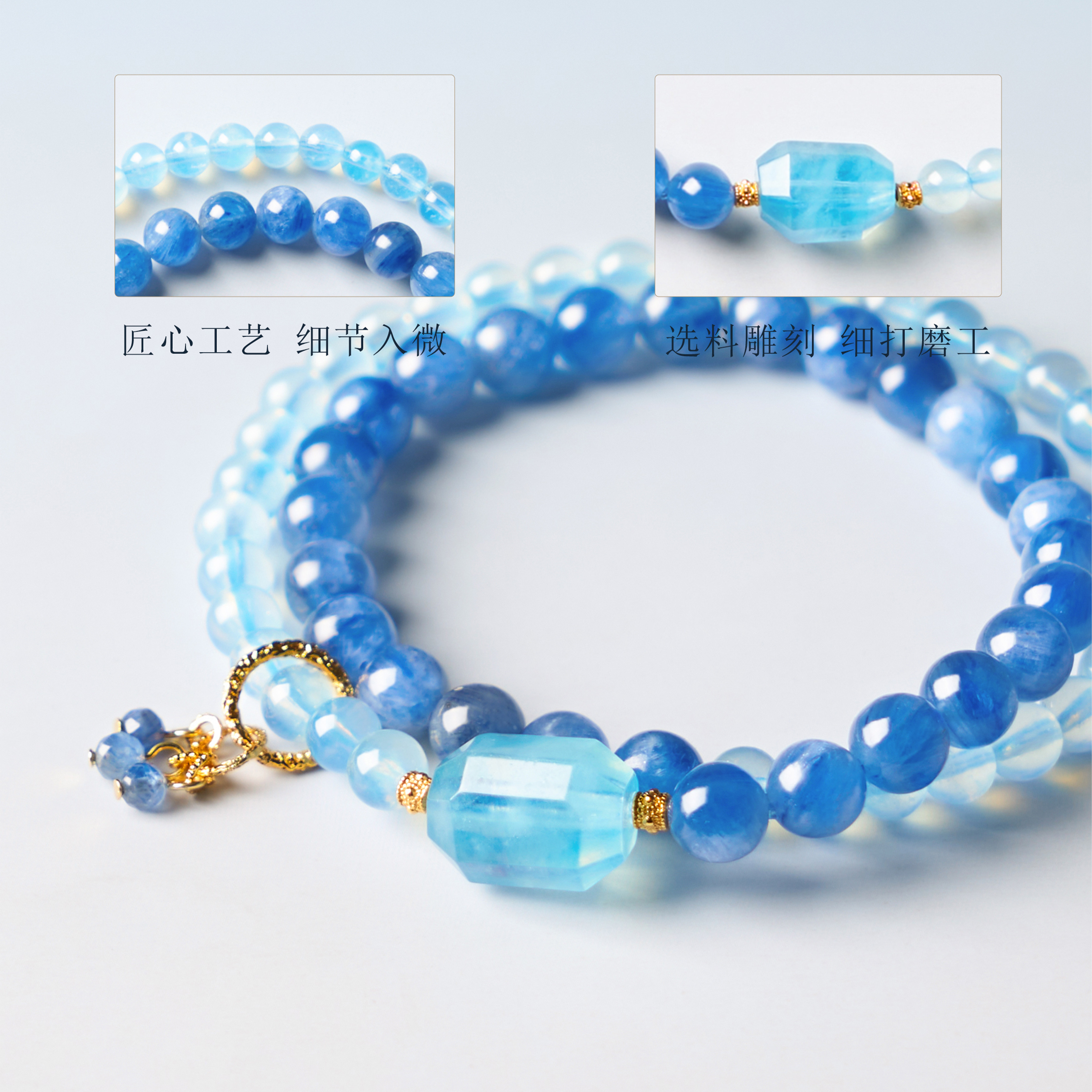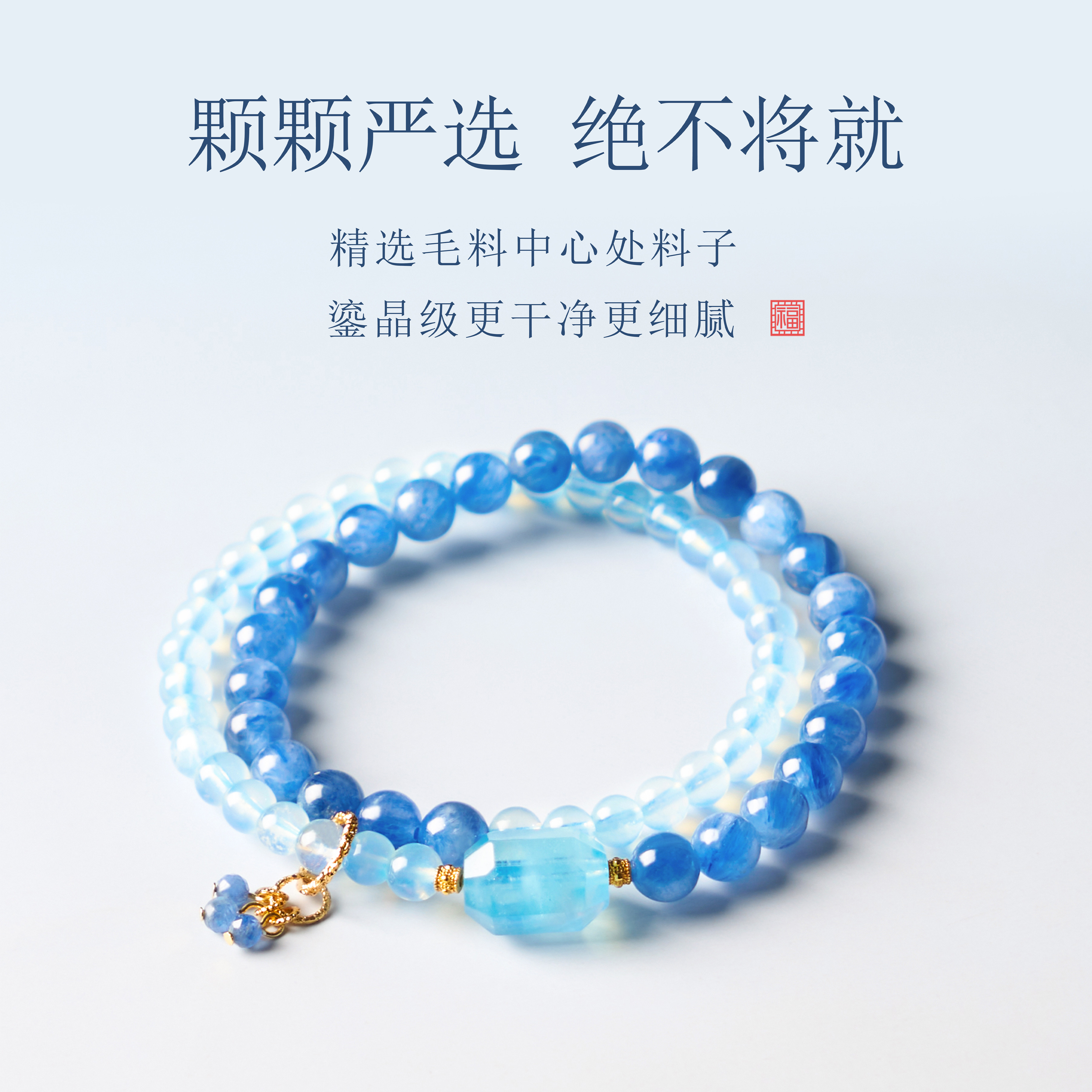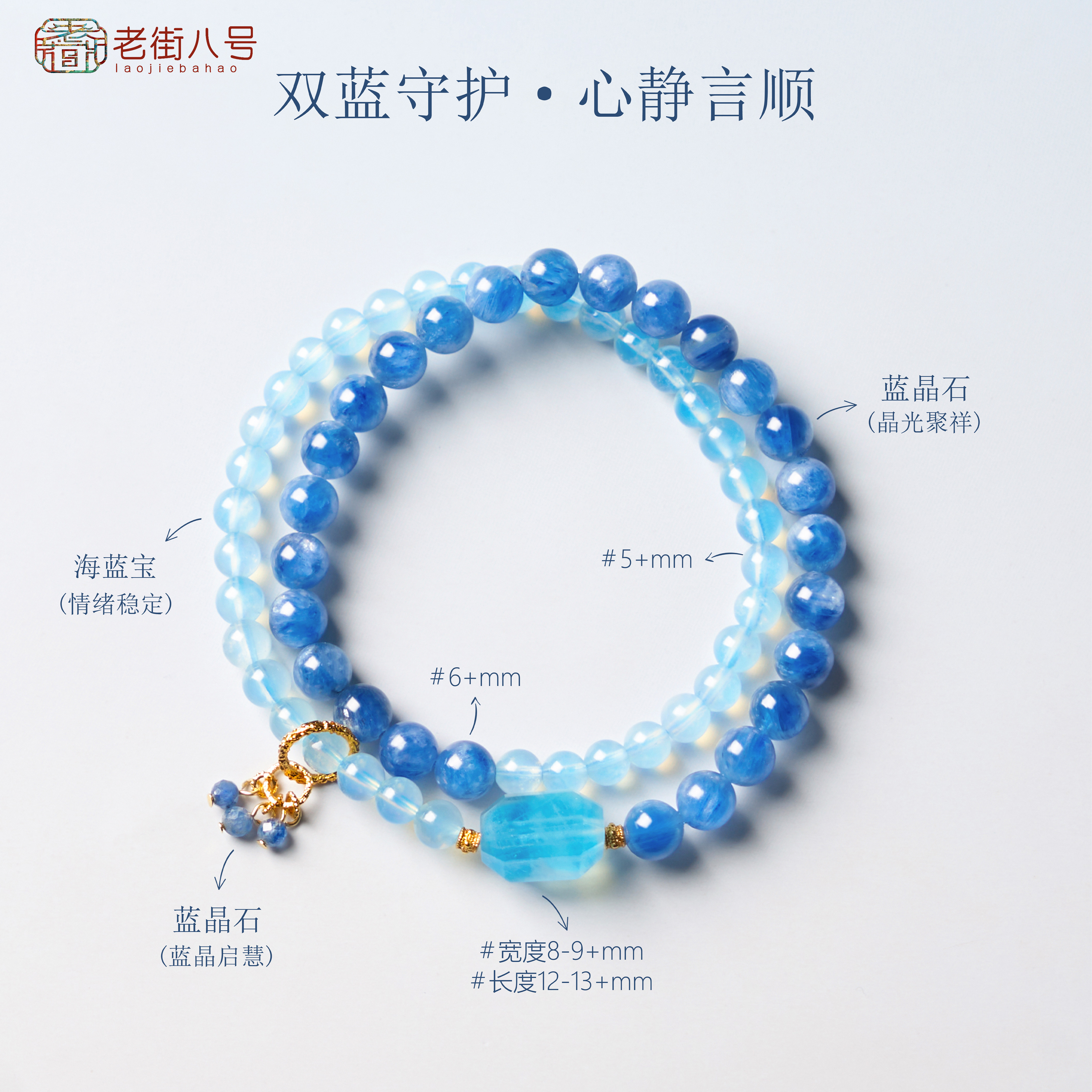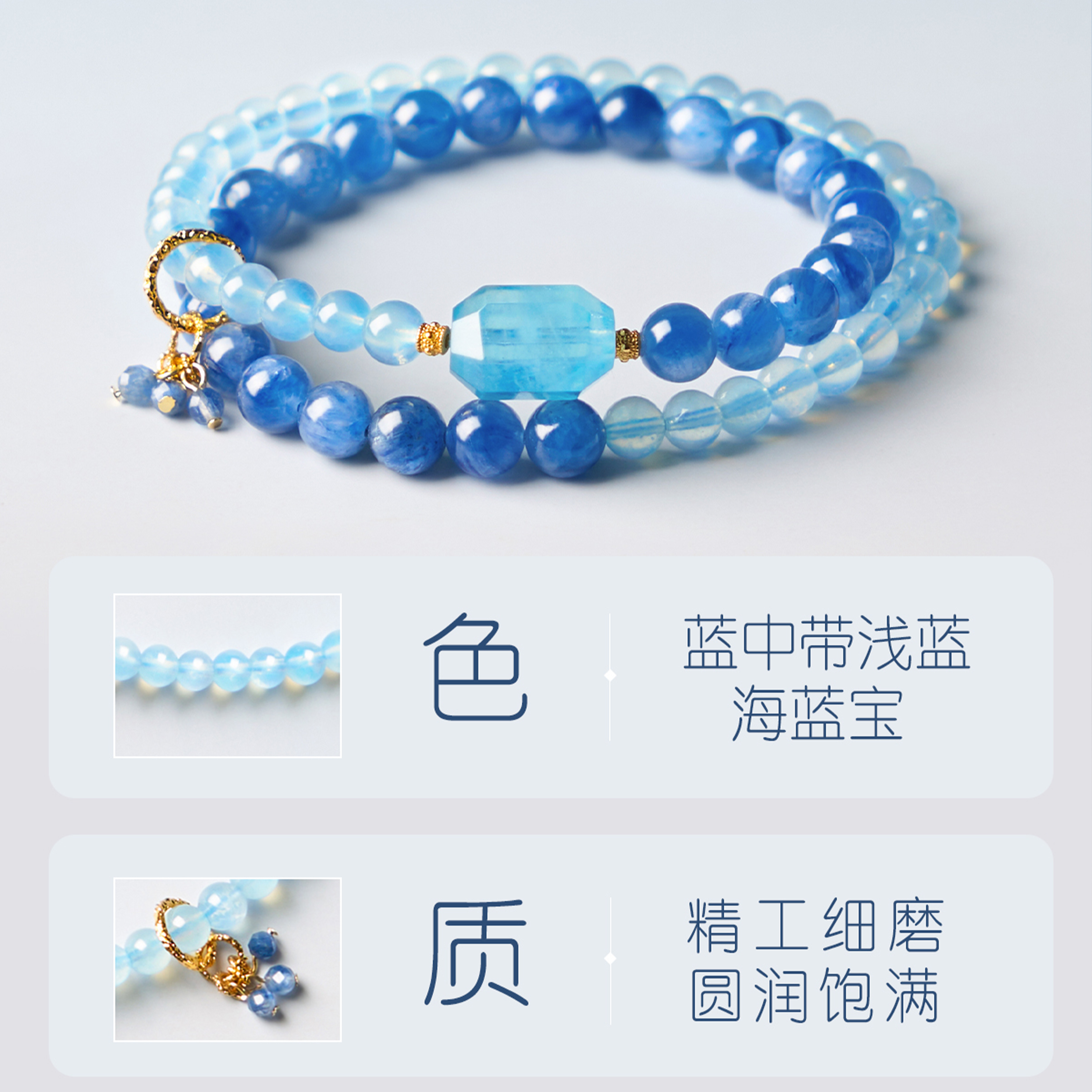 天然海蓝宝蓝晶石手串五路财神水润双晶珠宝奢华风手链蓝色水晶