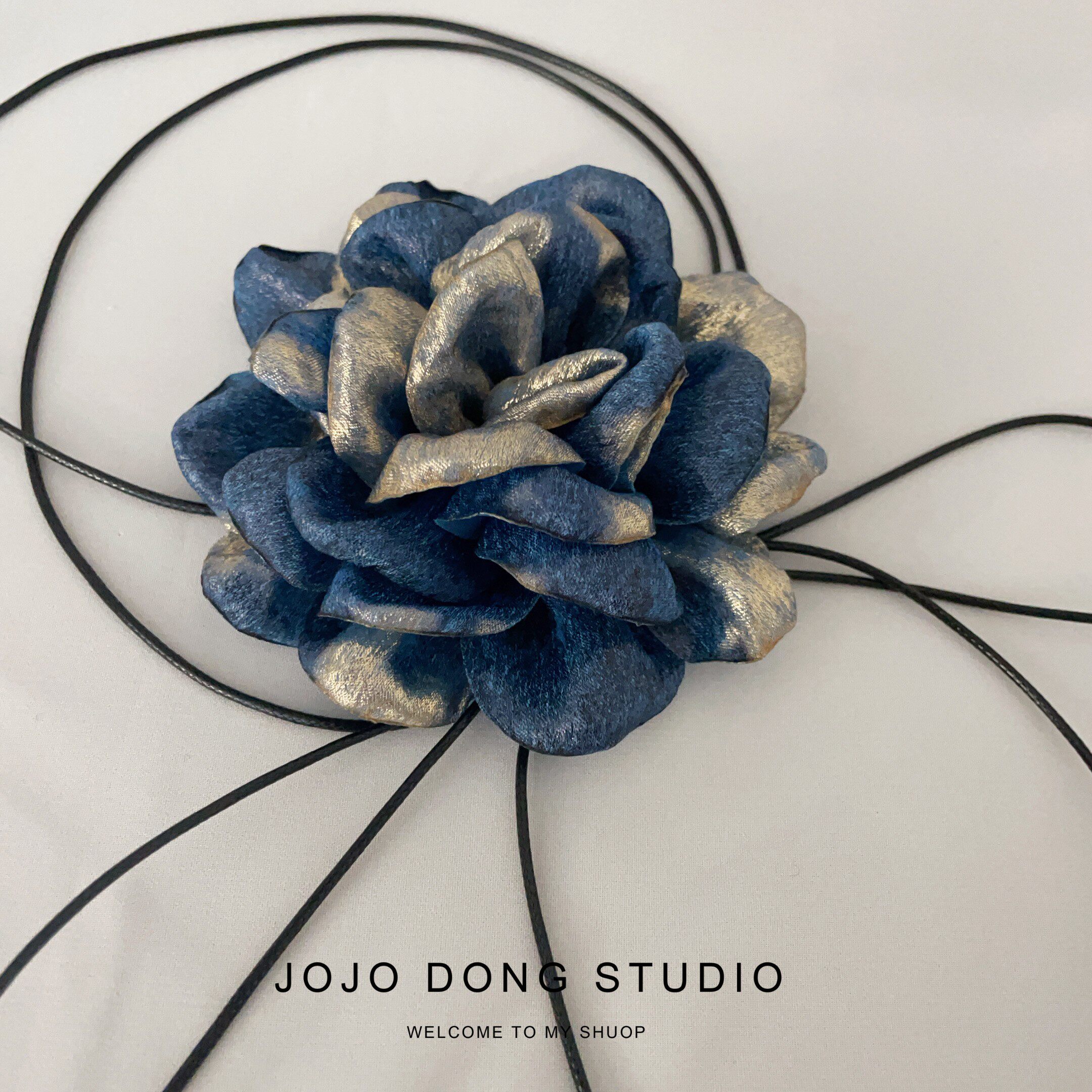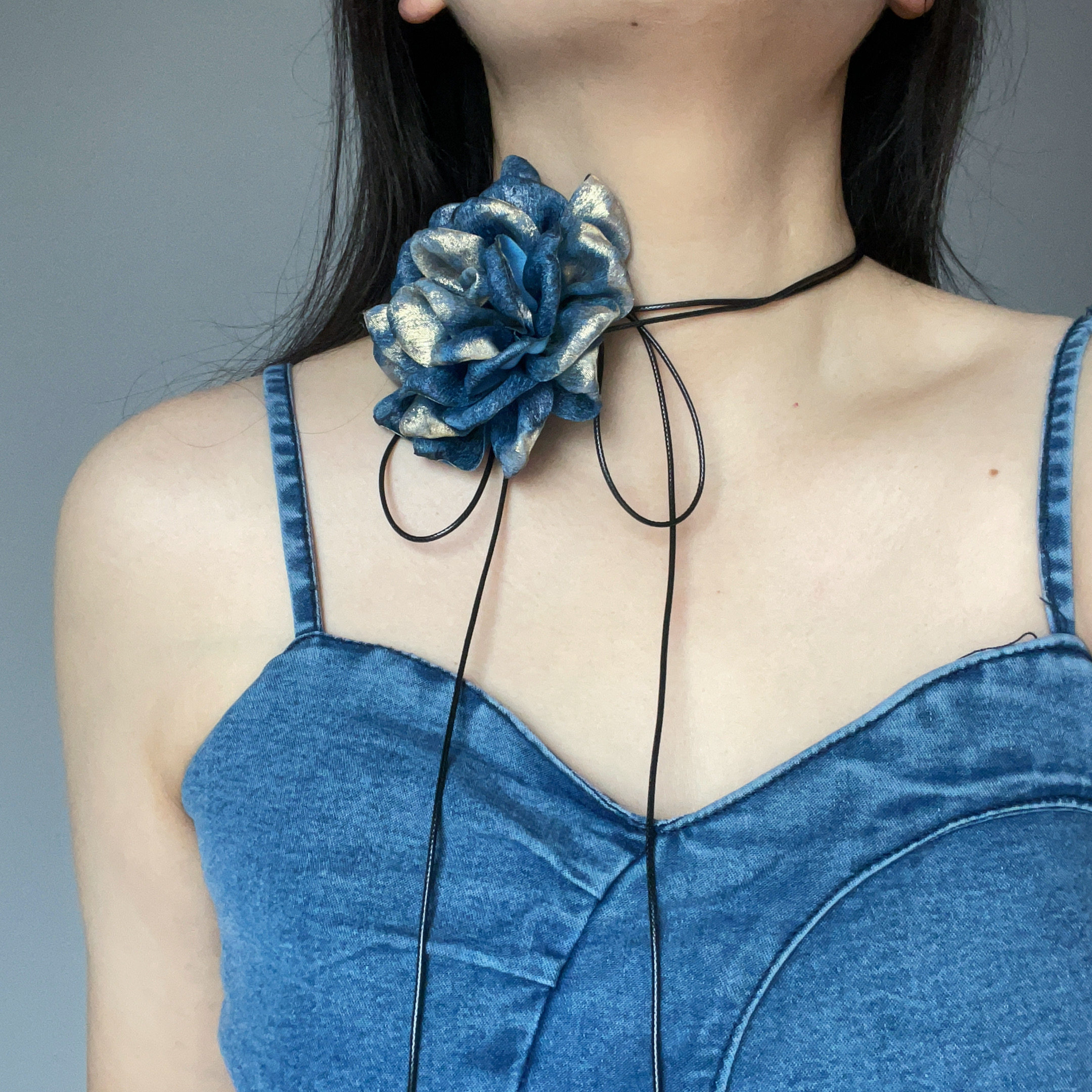 蓝色玫瑰大花朵绑带项链配饰颈饰辣妹复古花朵夸张拍照高级感颈带