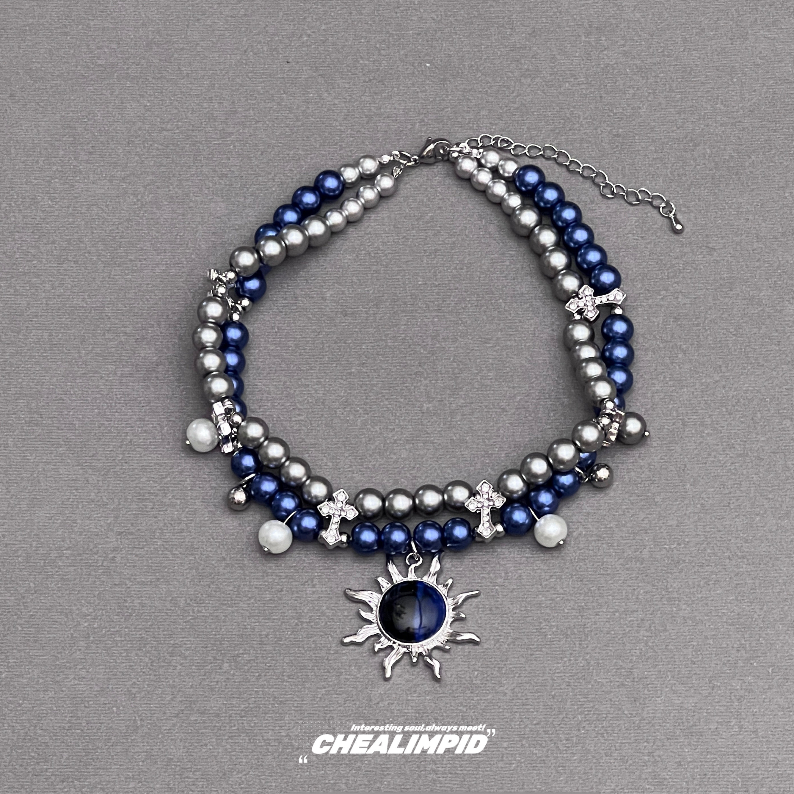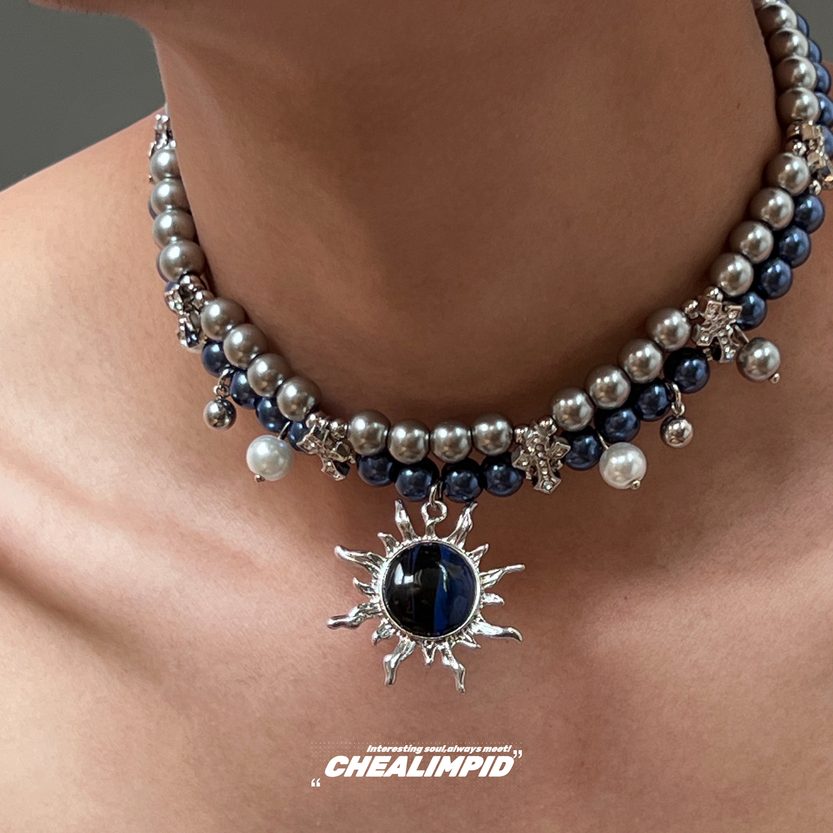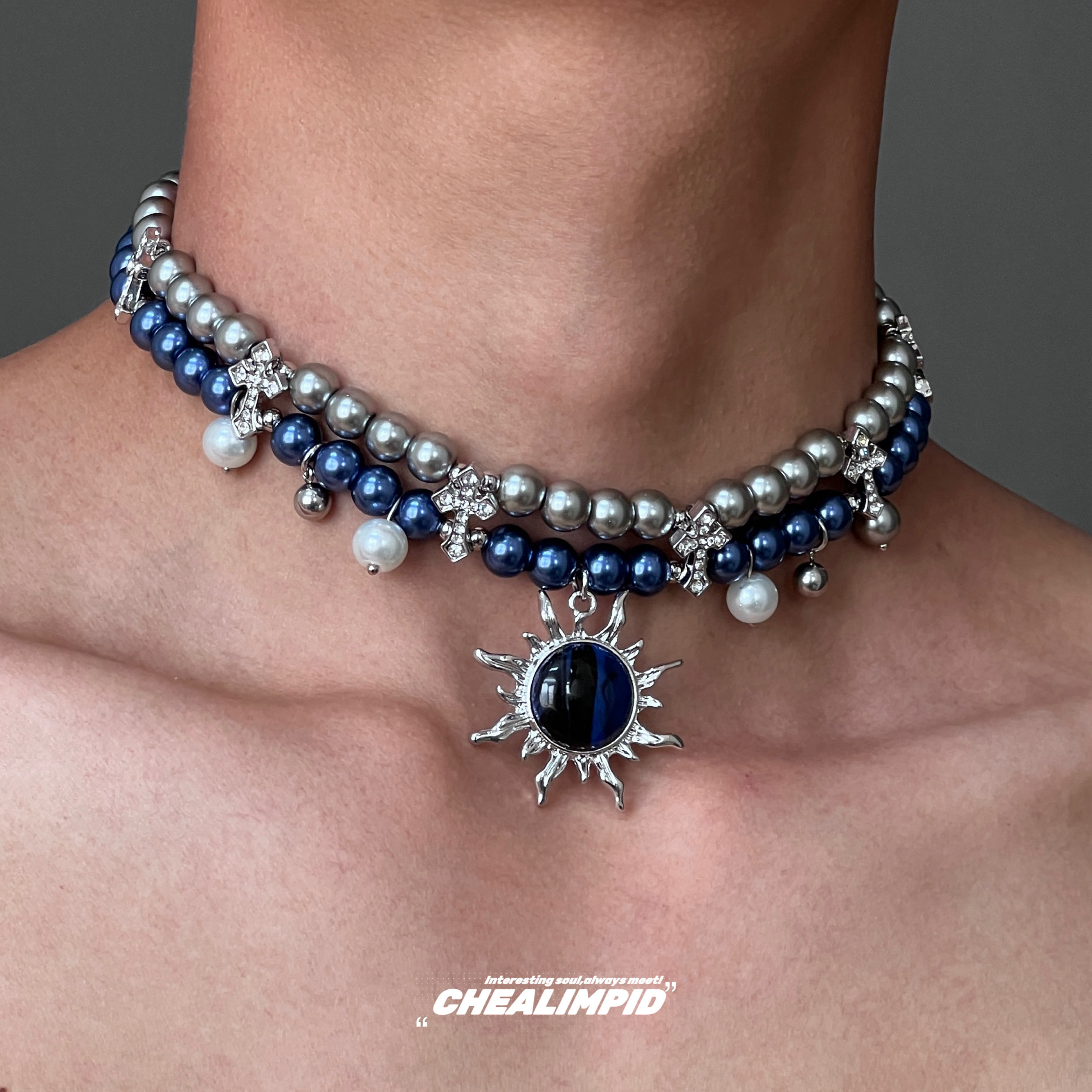 choker/.蓝色炽烈太阳十字架双层珍珠项链复古风辣妹y2k男女颈链