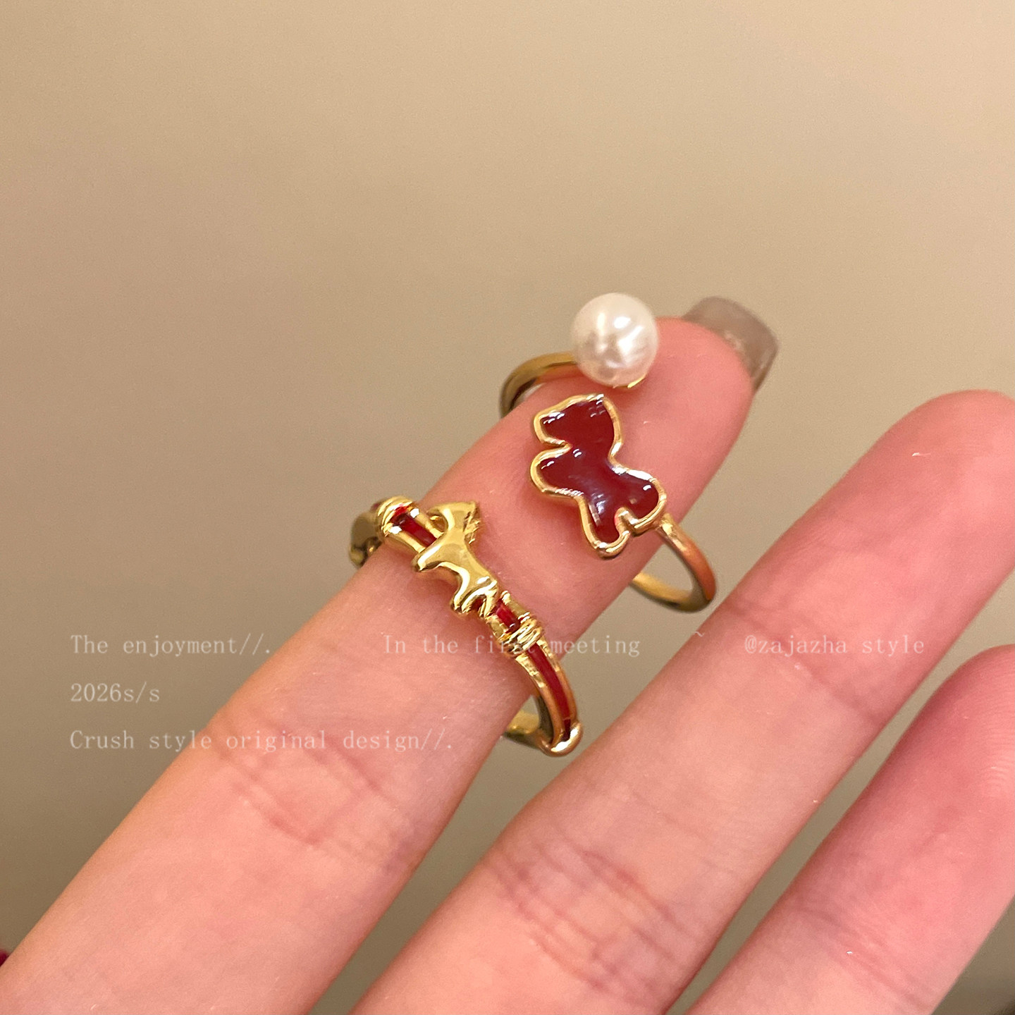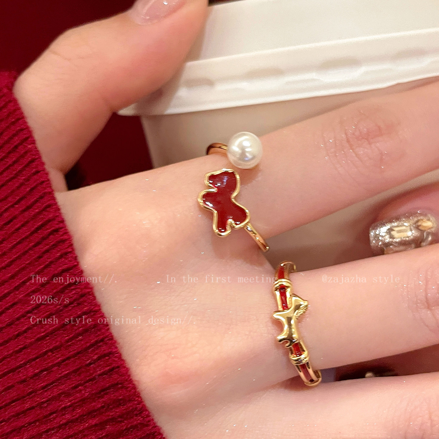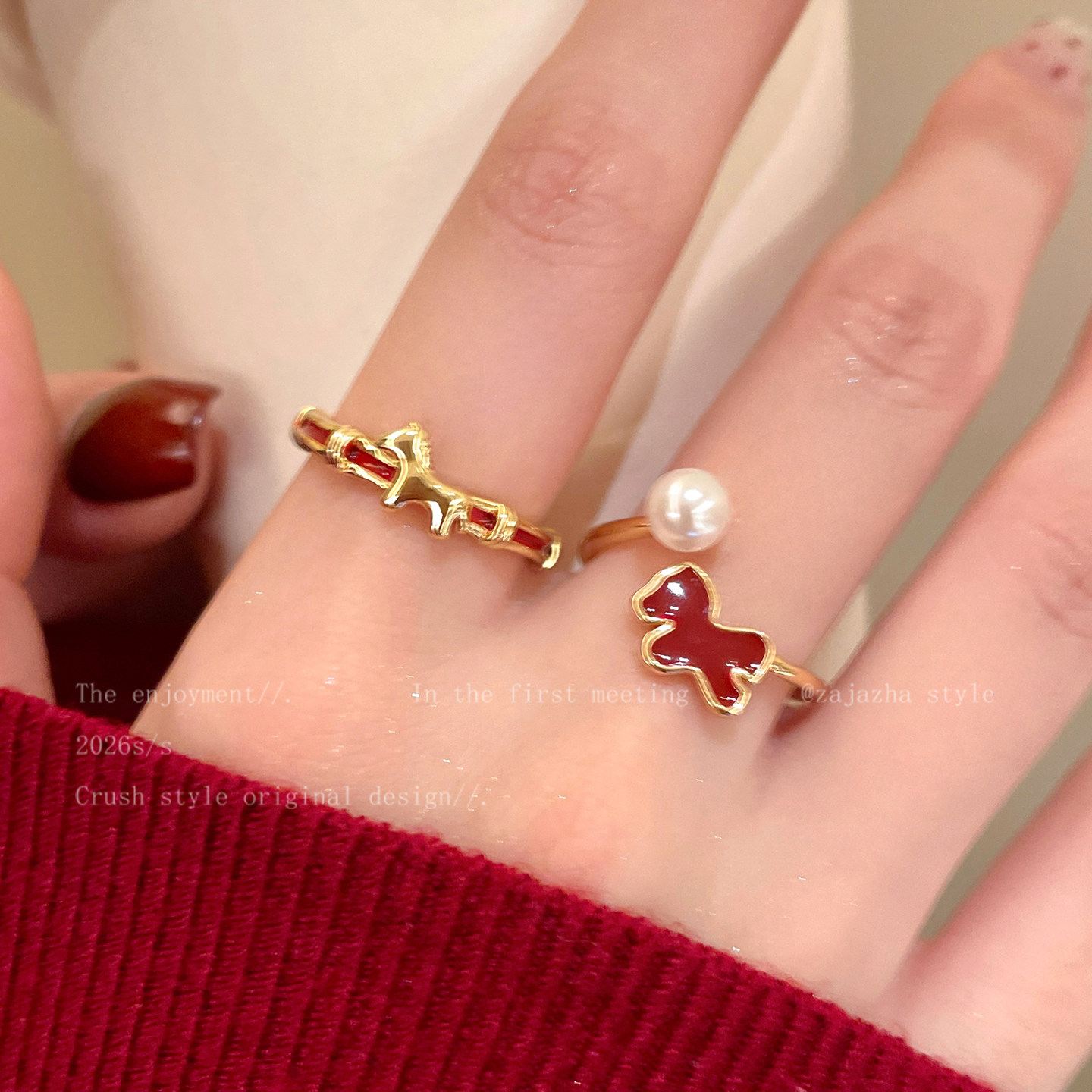 红色小马珍珠开口戒指女轻奢高级感叠戴食指戒马年小众设计感指环
