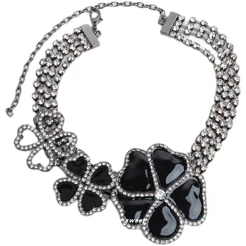 2024春季新款黑色滴釉镶钻项链手链轻奢夸张花朵礼服配饰锁骨链女