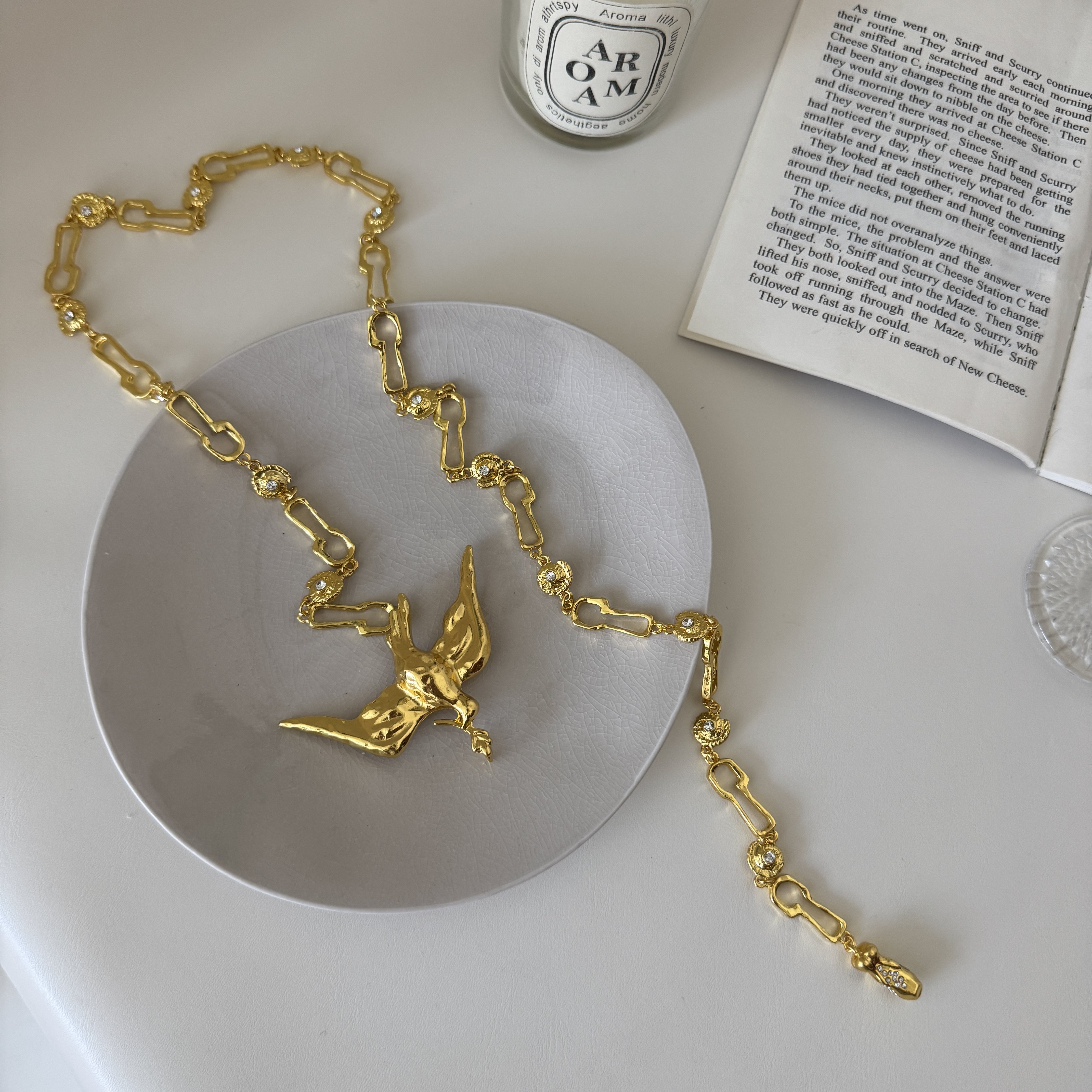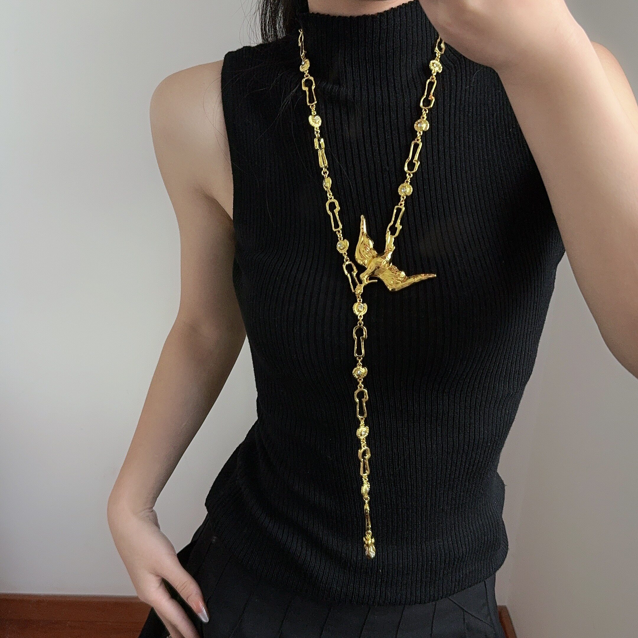 复古金色和平鸽橄榄枝挂扣腰链项链锁孔拼接链条长款时髦毛衣链女