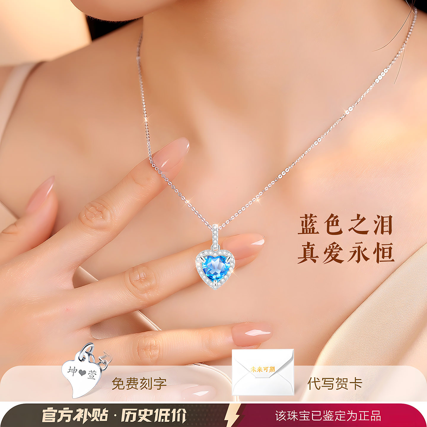 天然蓝色宝石999纯银海洋之心项链女款女士女吊坠生日礼物送女友