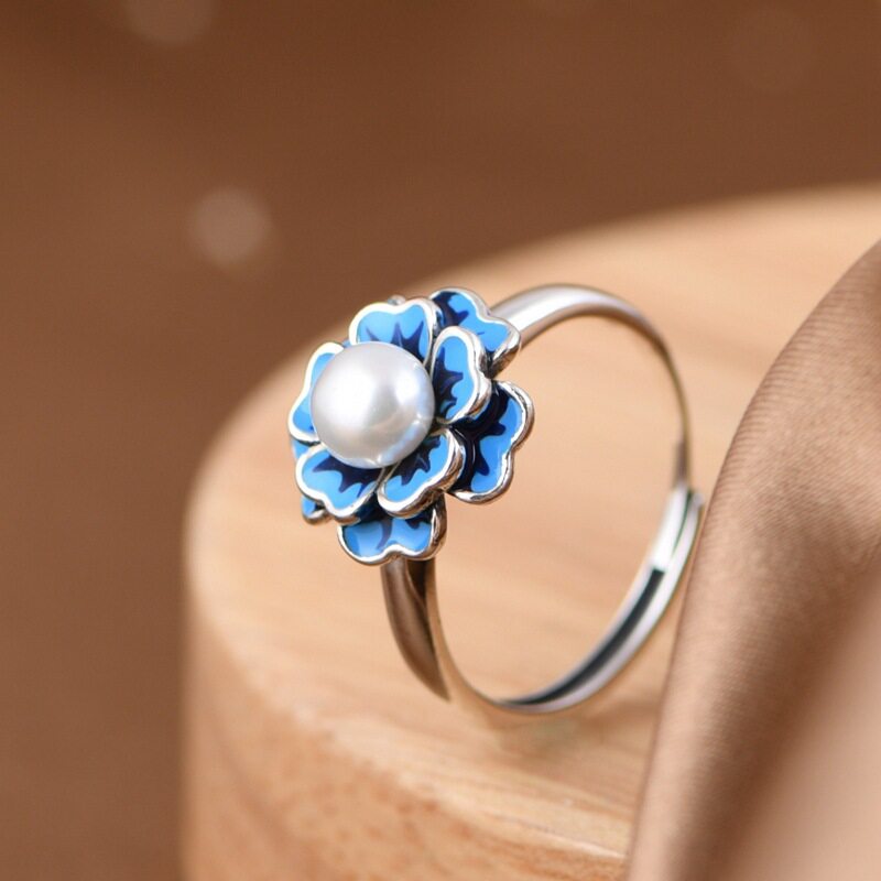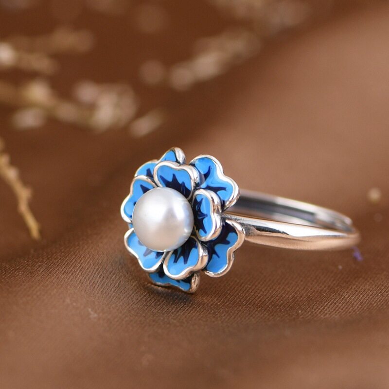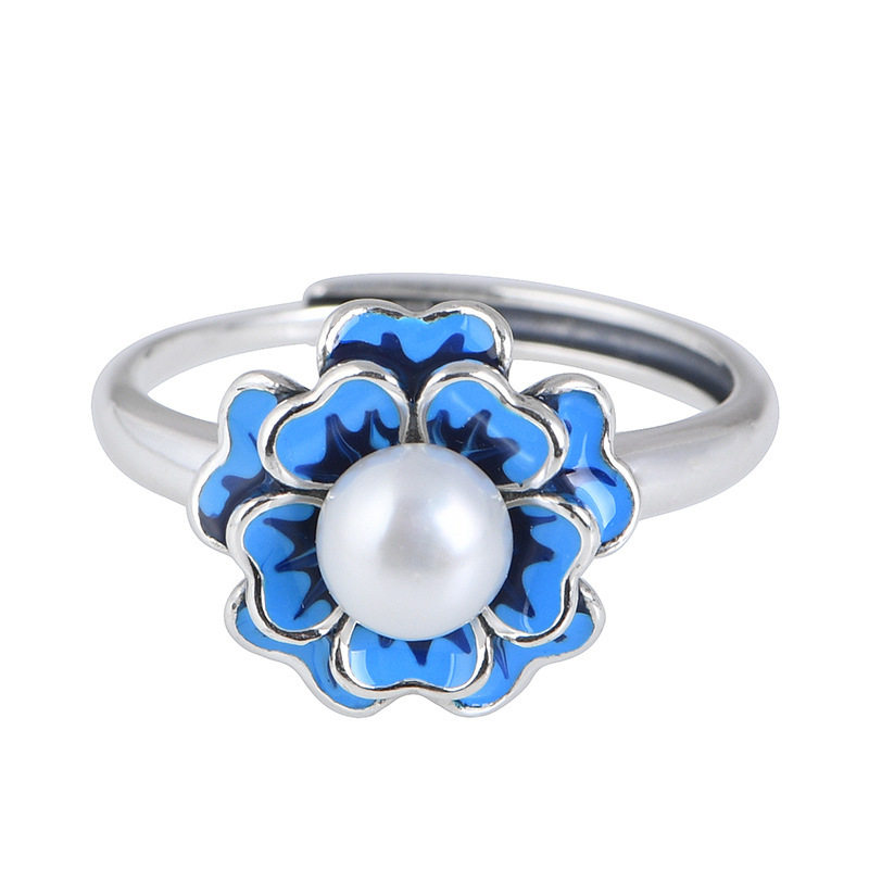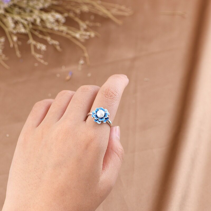 英国TopWhit珍珠花朵戒指复古景泰蓝文艺范气质女蓝色小花个性