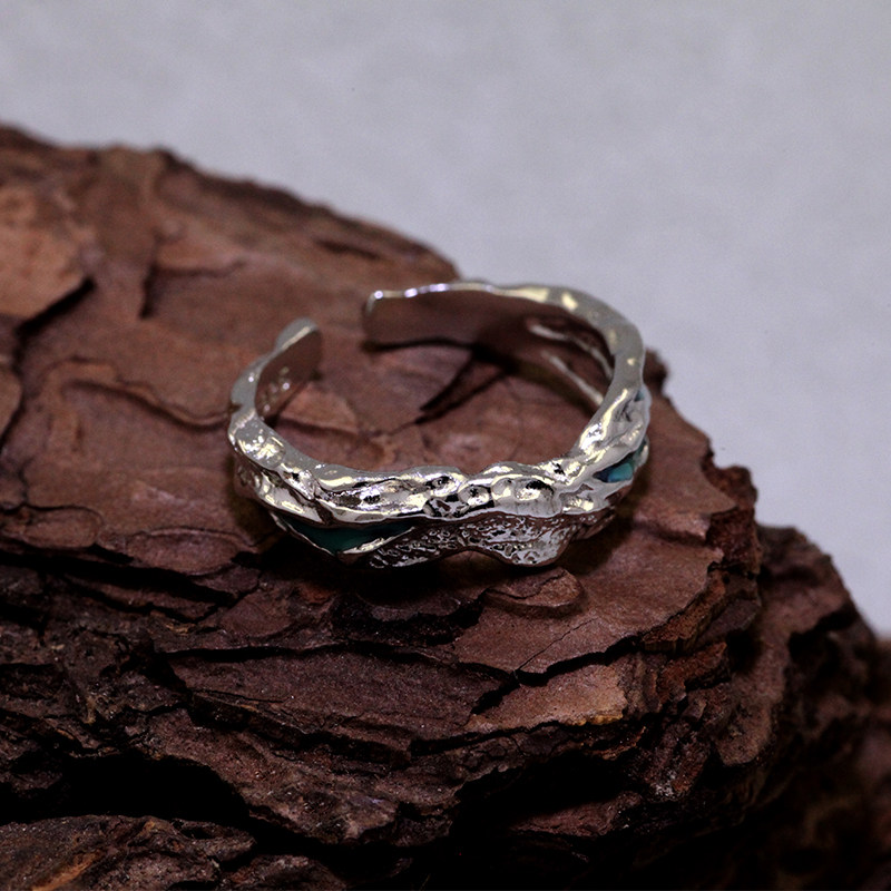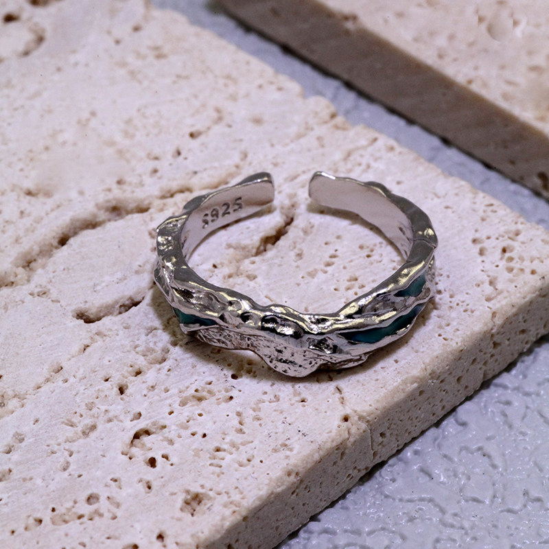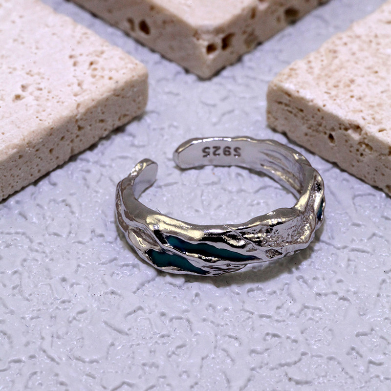 绿色指环小众设计感不规则纹理质感滴釉开口S925纯银戒指女