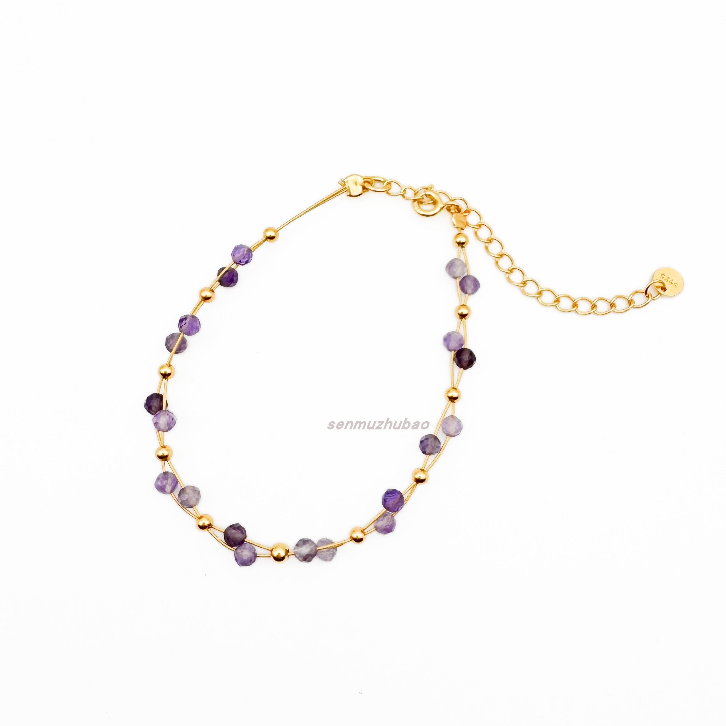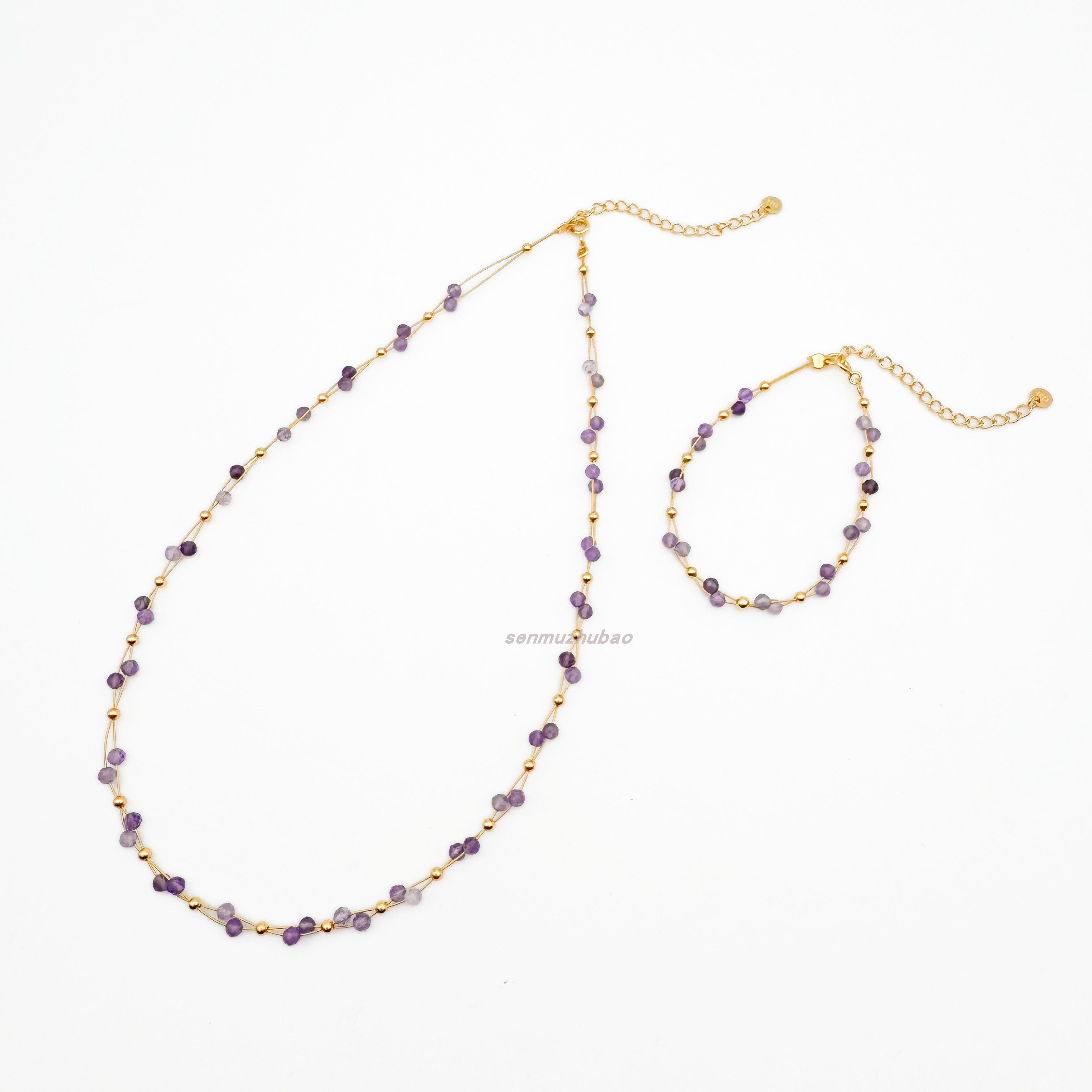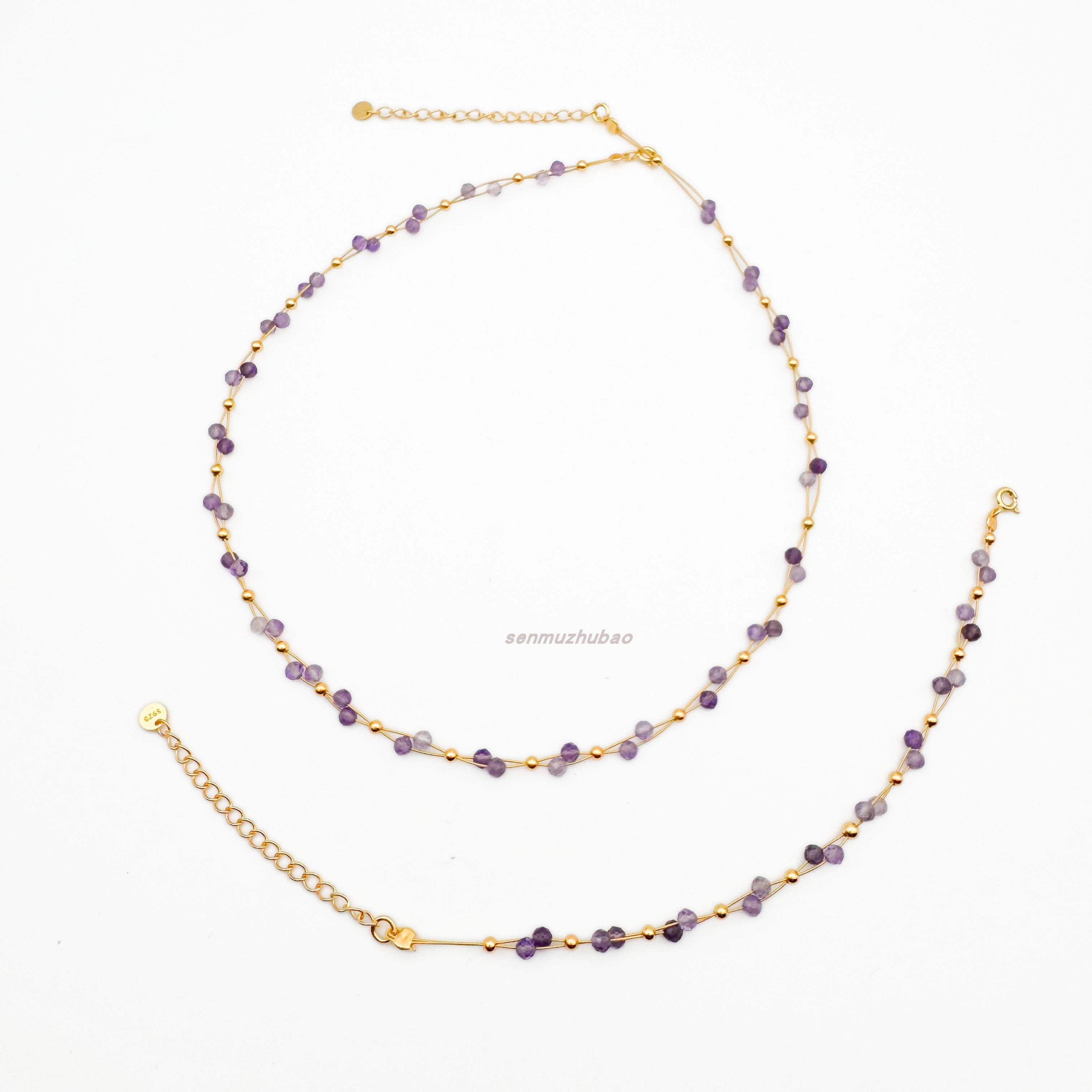925银镀金法式浪漫紫色复古小众设计双层错位紫水晶手链项链套装