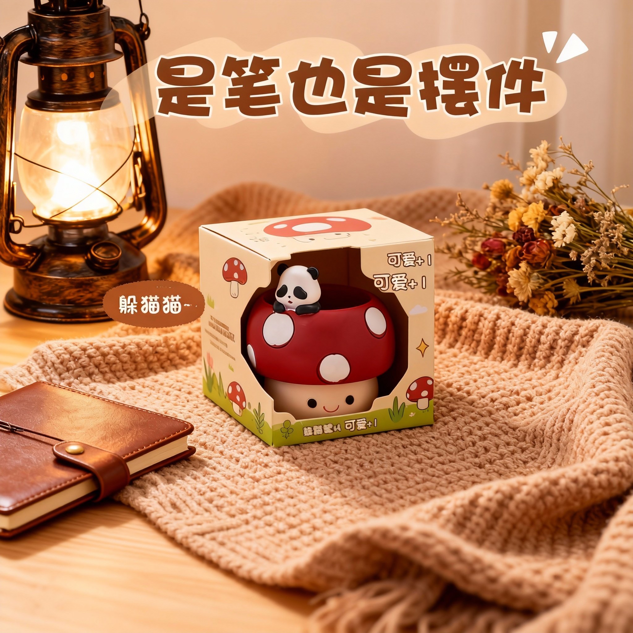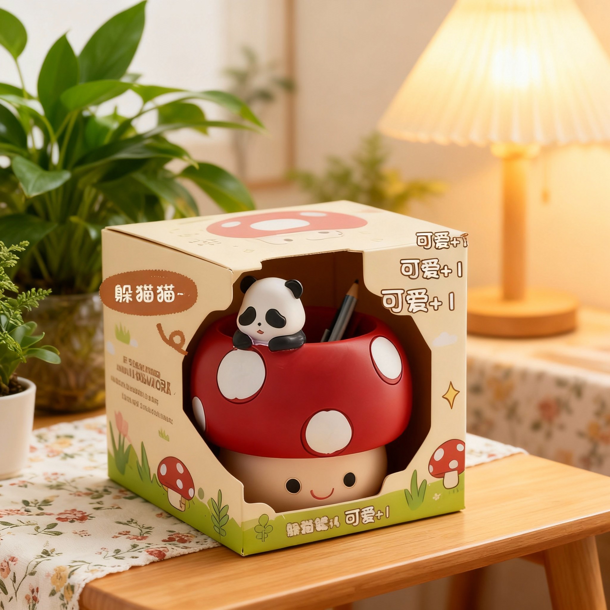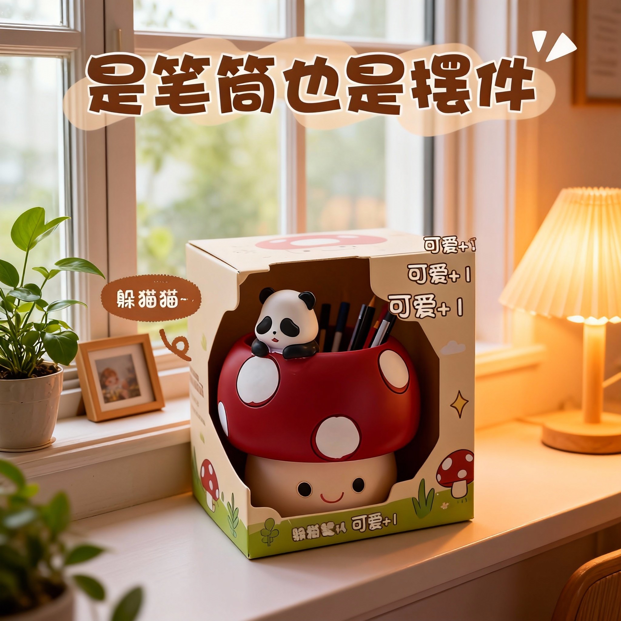 可爱卡通熊猫蘑菇摆件桌面装饰收纳盒创意文具收纳神器