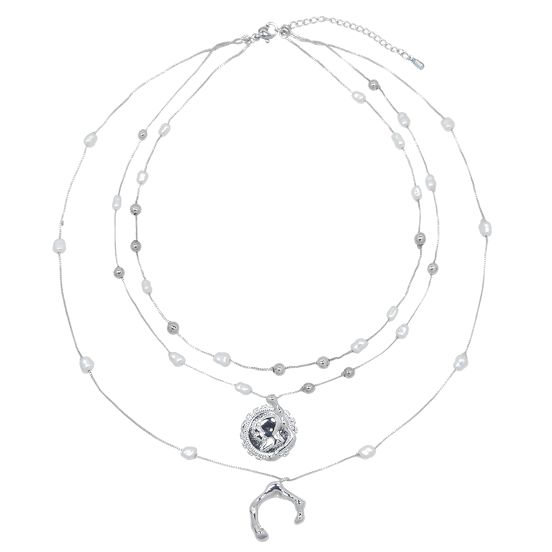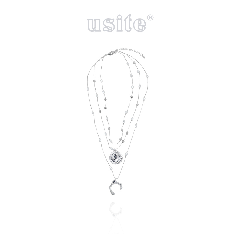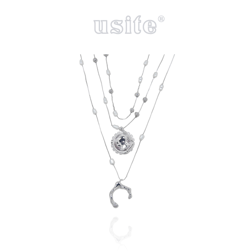 USITE三层叠戴S925银外星遗迹硬币珍珠项链女张俪孙千同款锁骨链