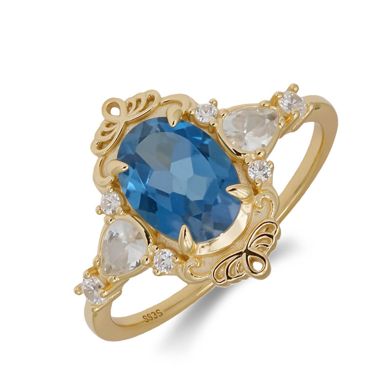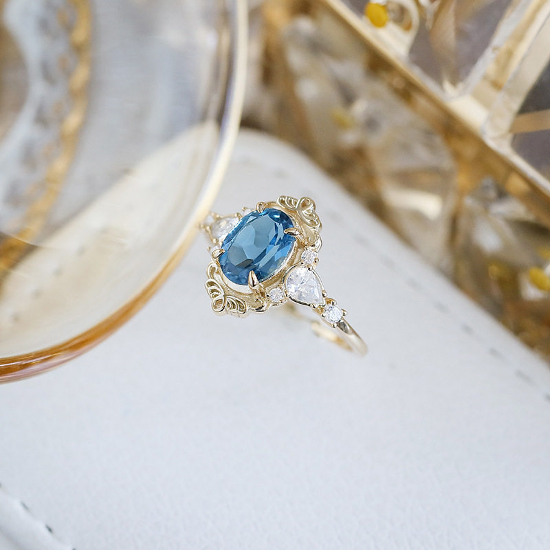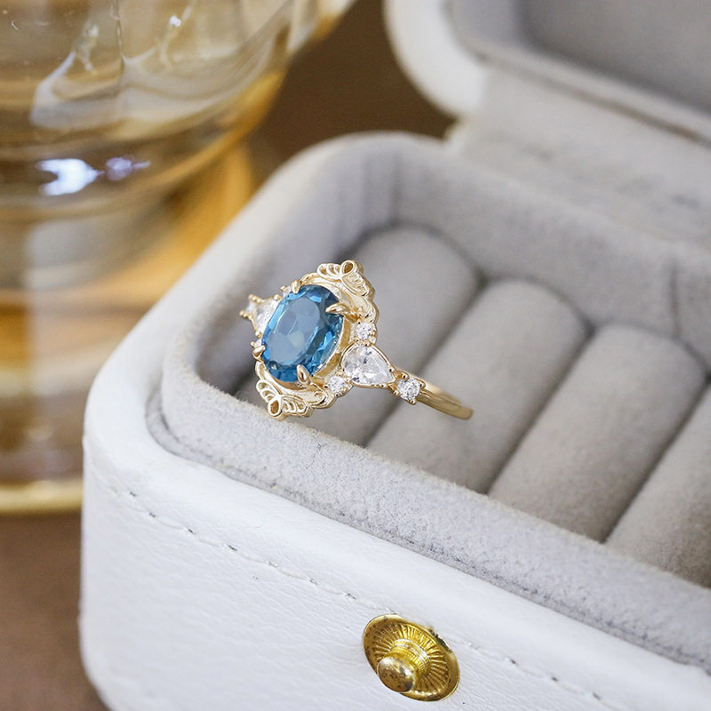 轻奢珠宝静谧蓝调 时尚天然伦敦蓝托帕石S925银镀14K戒指錾刻指环