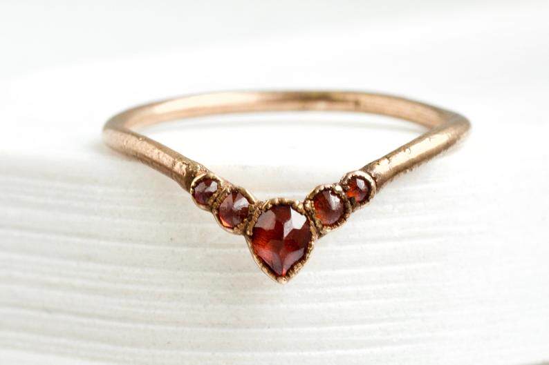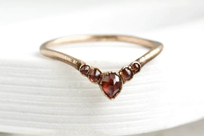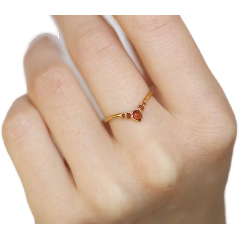 海外代购Garnet◇手作复古红色石榴石波浪V形18K镀金纯银结婚戒指