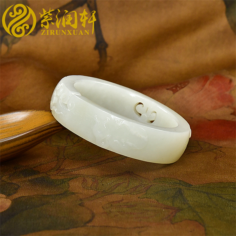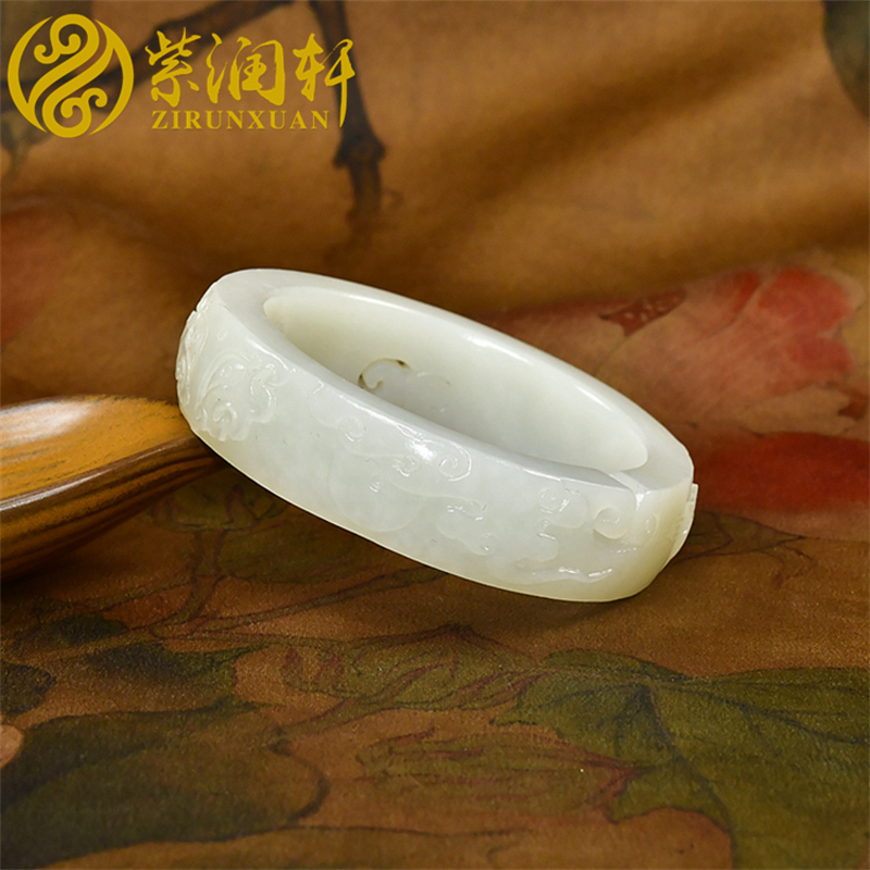 紫润轩新疆和田玉白玉手镯方条57MM祥云兽面且末料哑光镂空收藏级