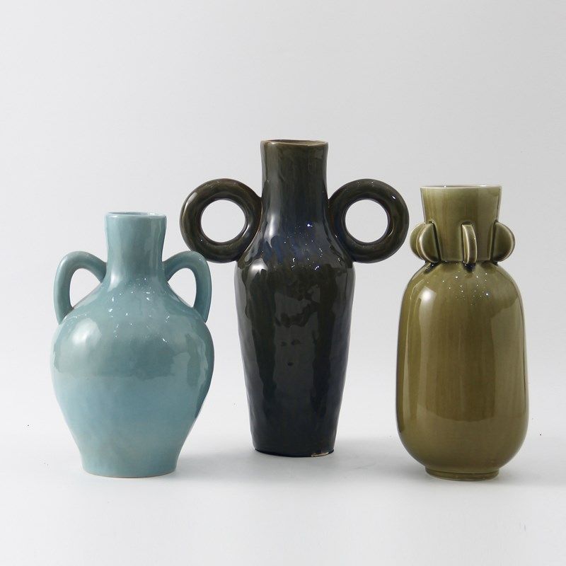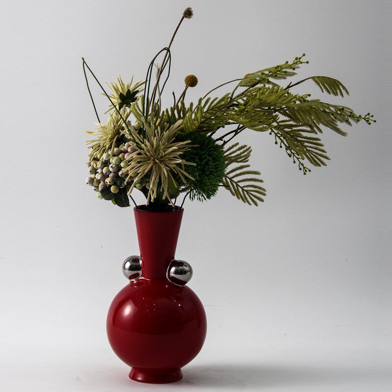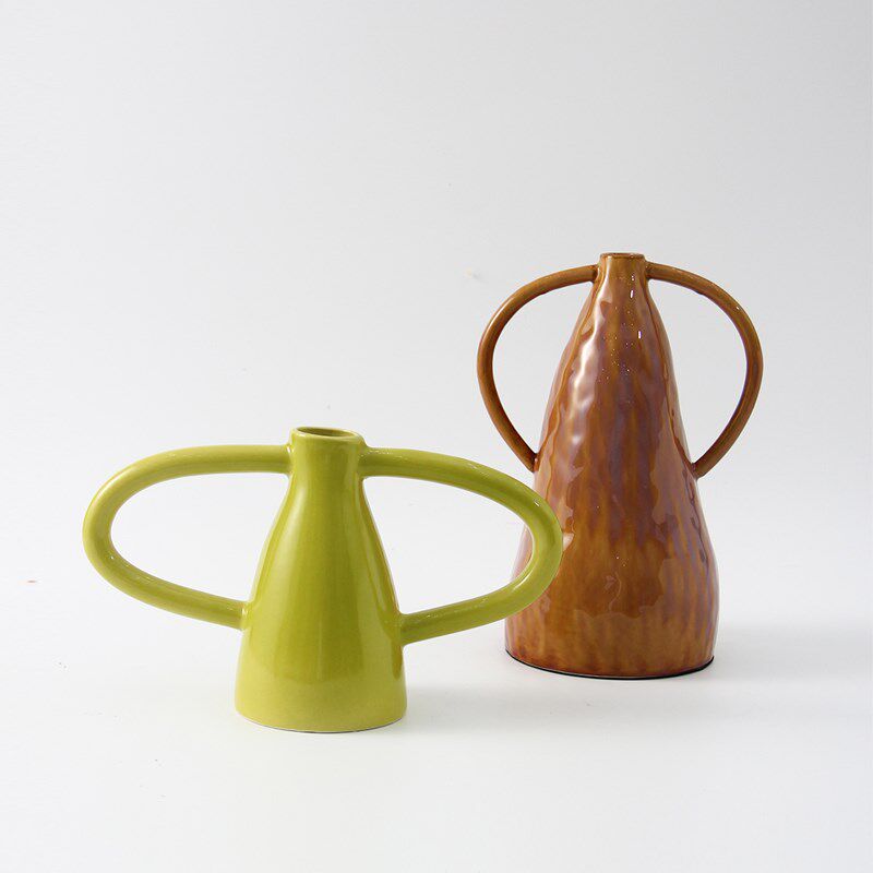现代北欧复古双耳彩色陶瓷花瓶摆件样板房酒店客厅玄关大红色花器