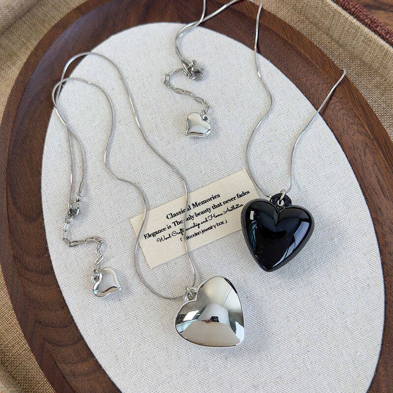 韩国时尚百搭ins风黑色金属爱心吊坠项链甜酷银色蛇骨链长款项链