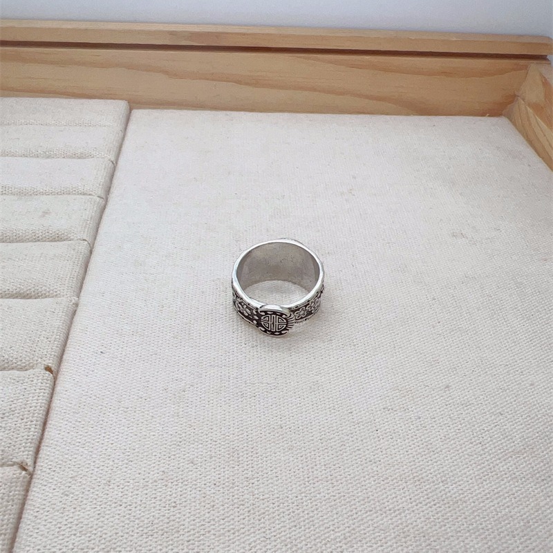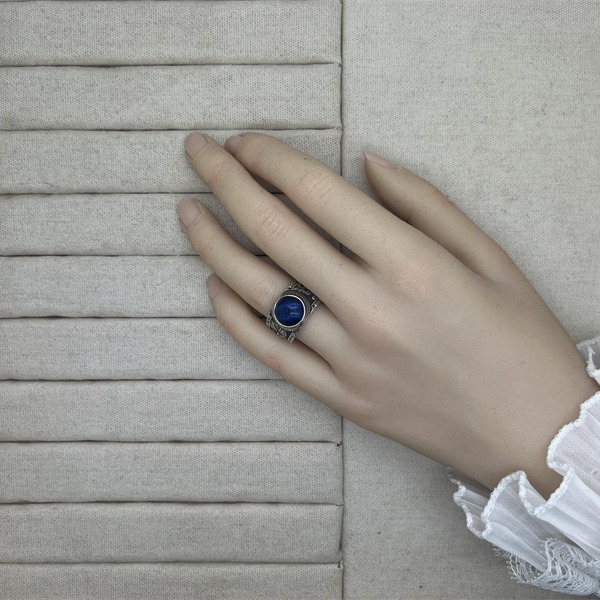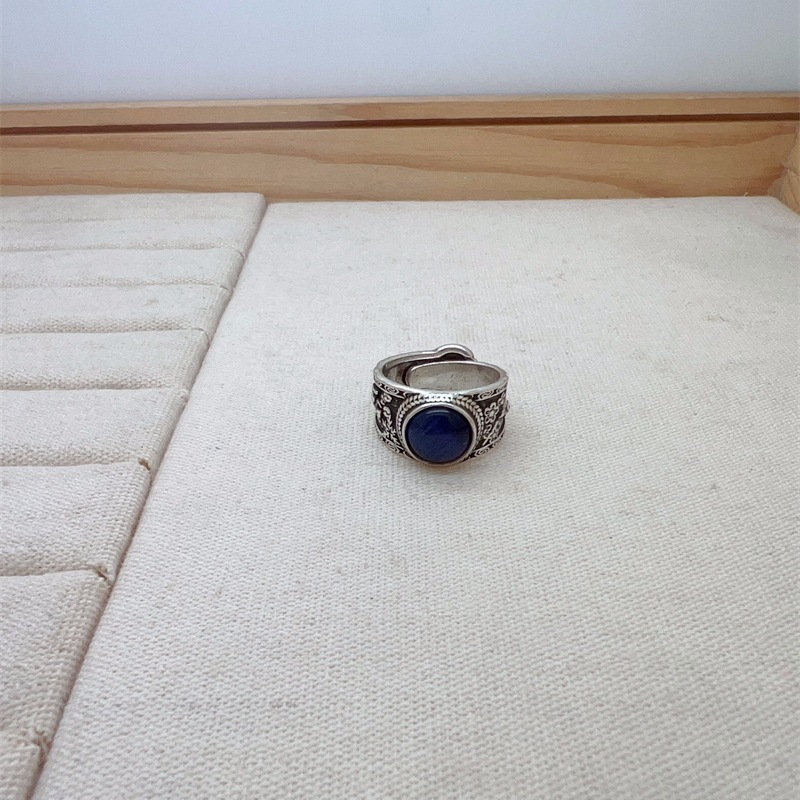 饰尚e族蓝色圆形锆石戒指女宽边浮雕精致花纹开口指环ins食