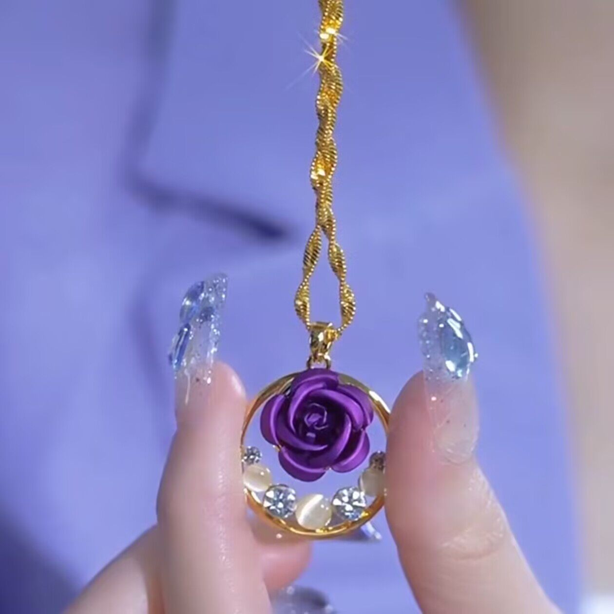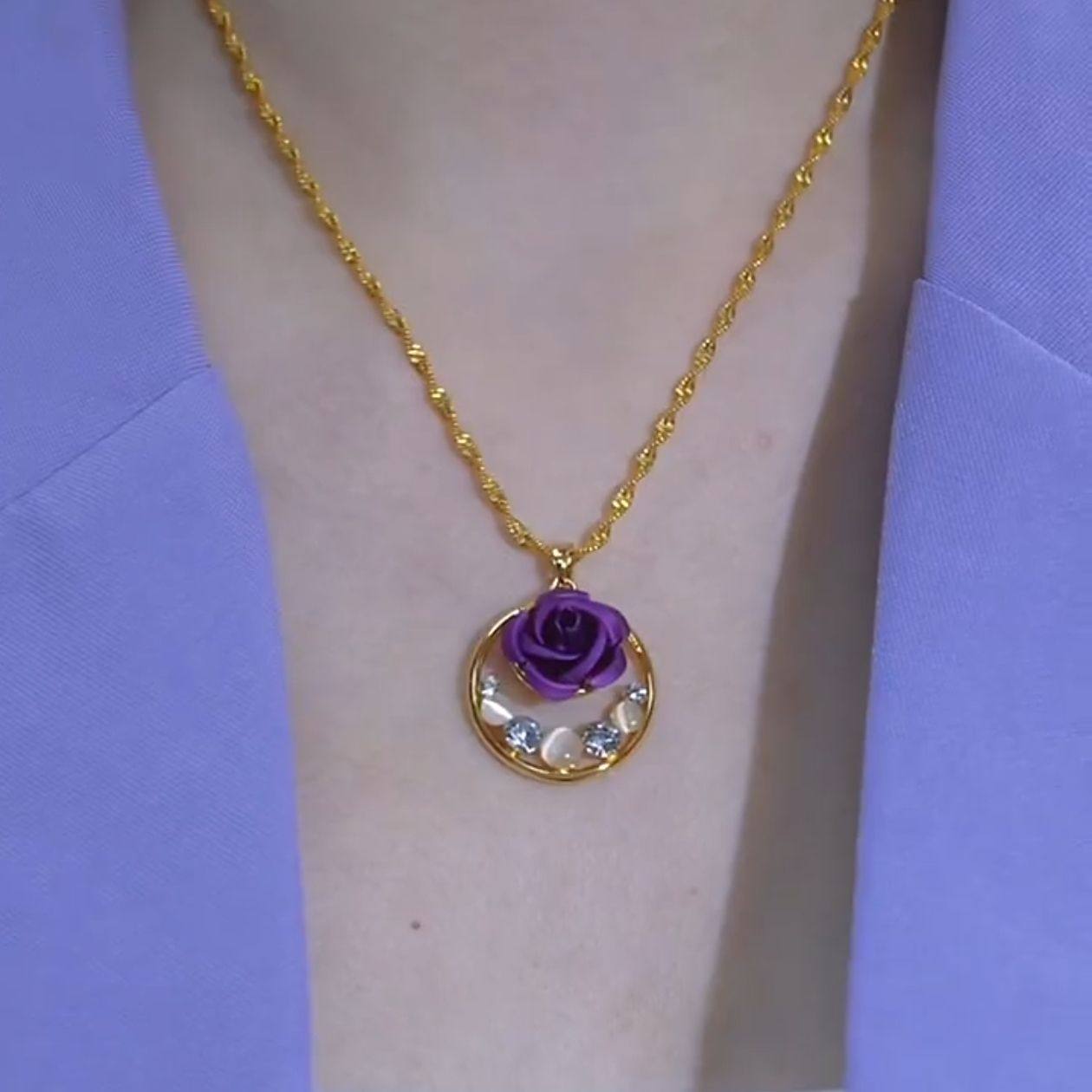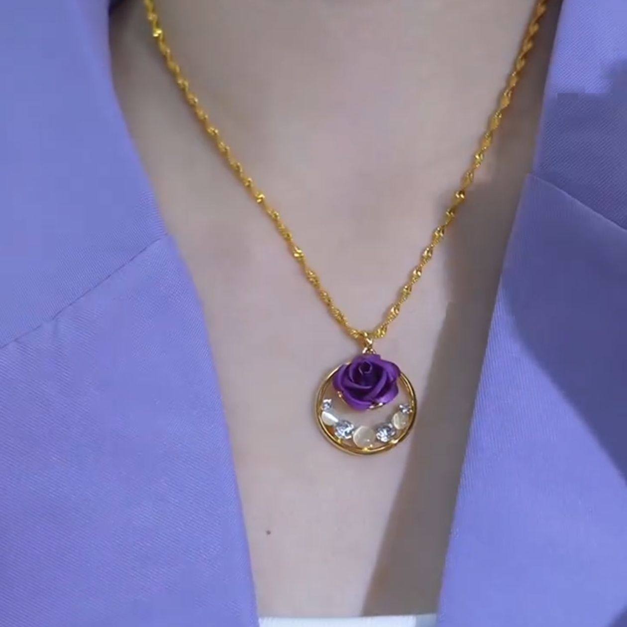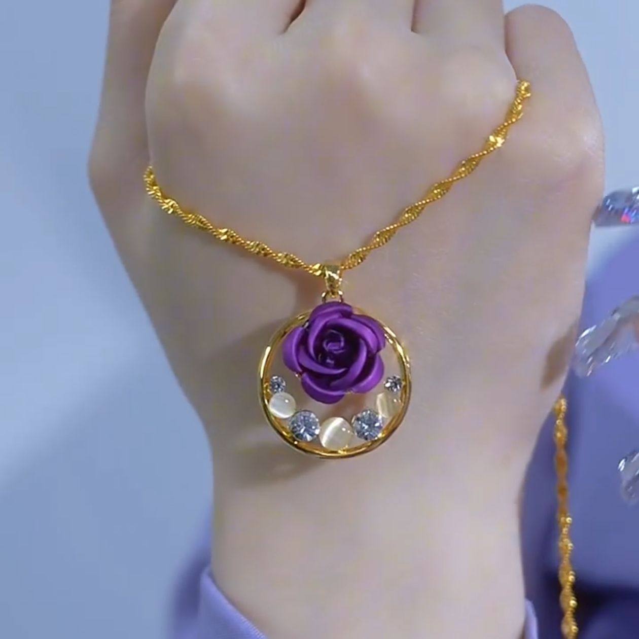 新款港风紫色玫瑰花平安扣项链女小众简约紫罗兰花朵猫眼石锁骨链
