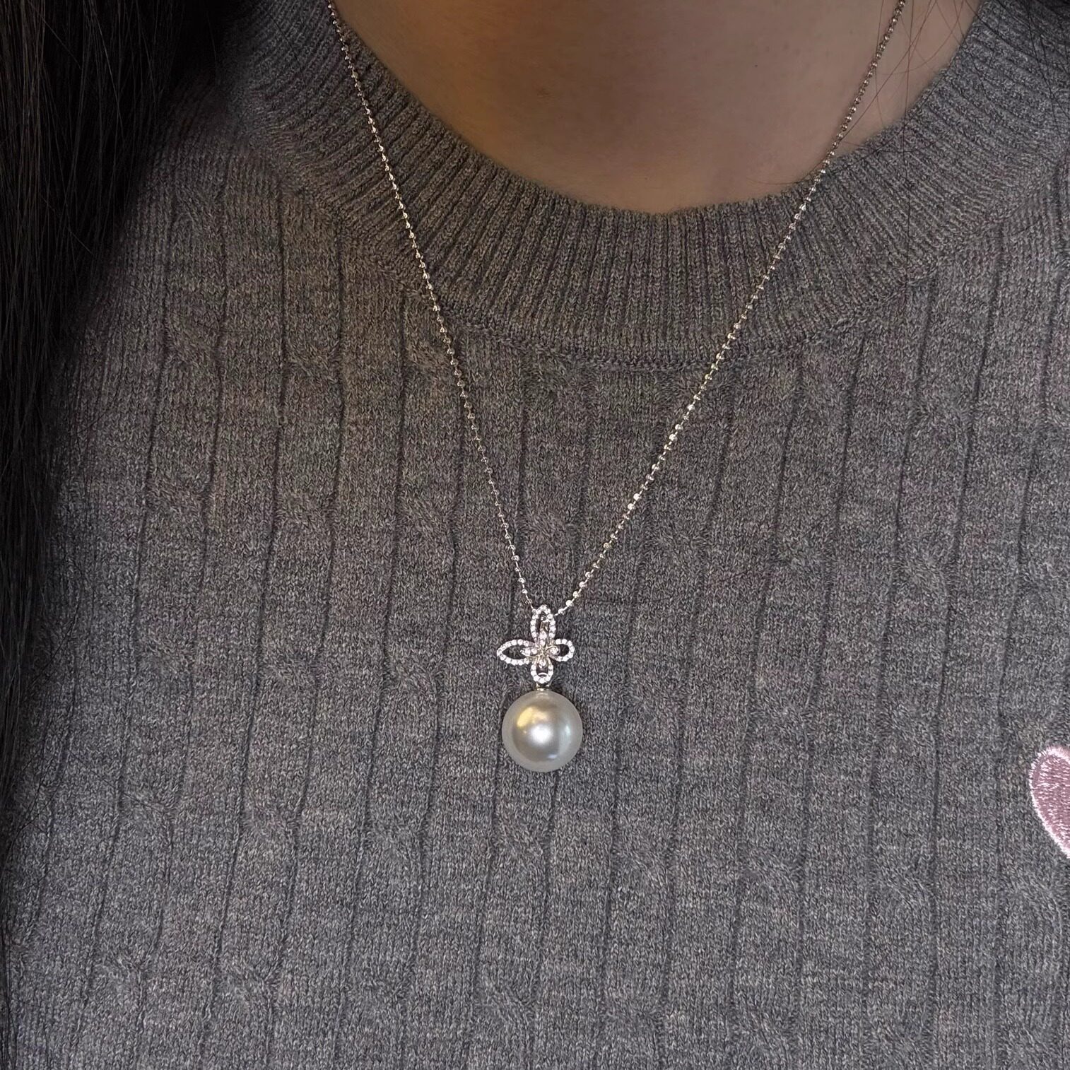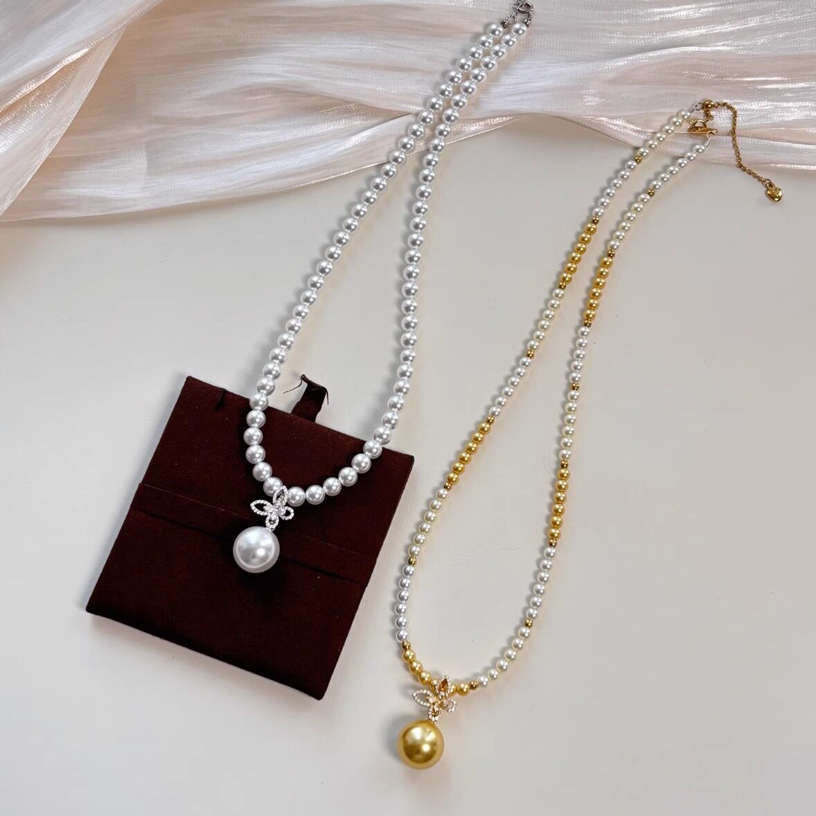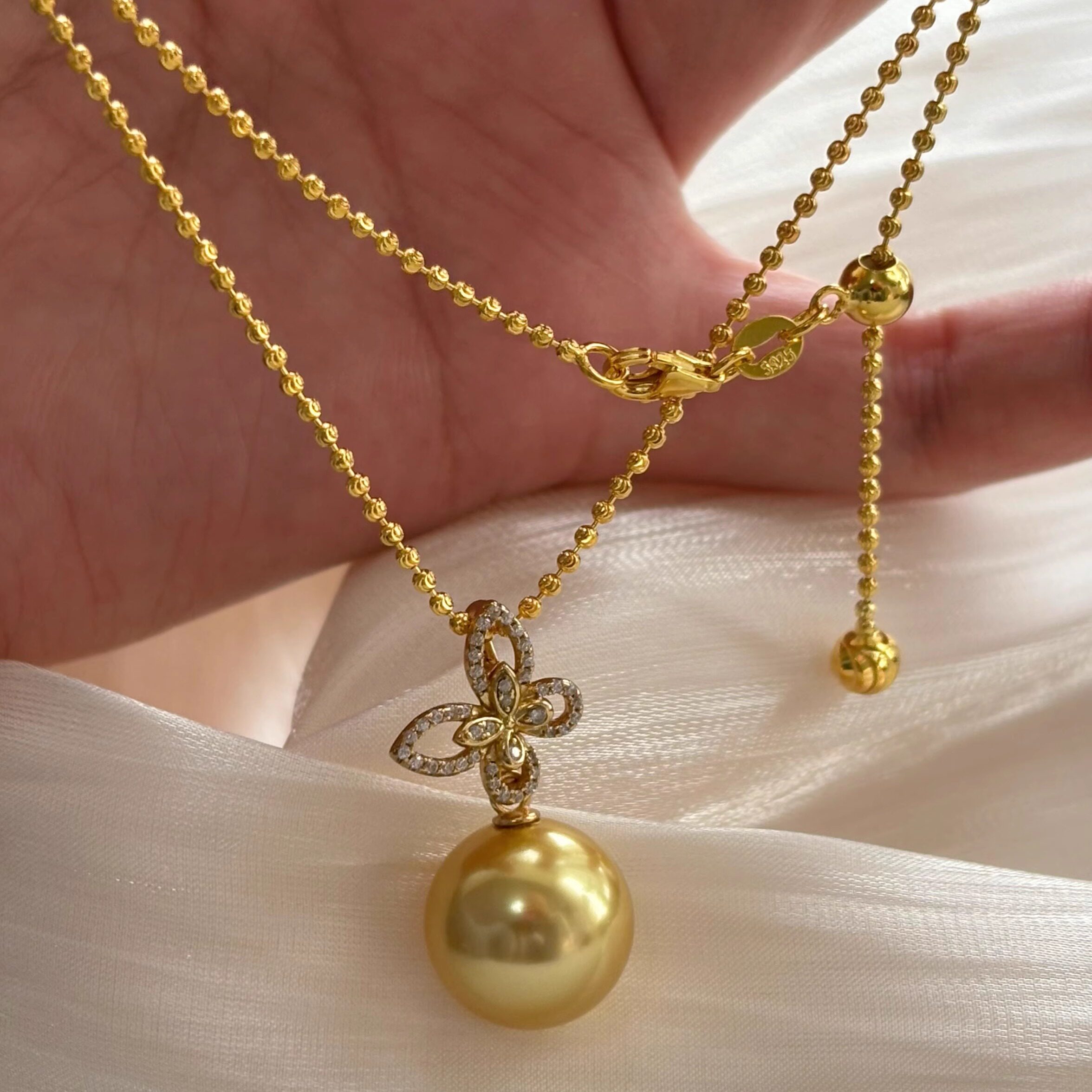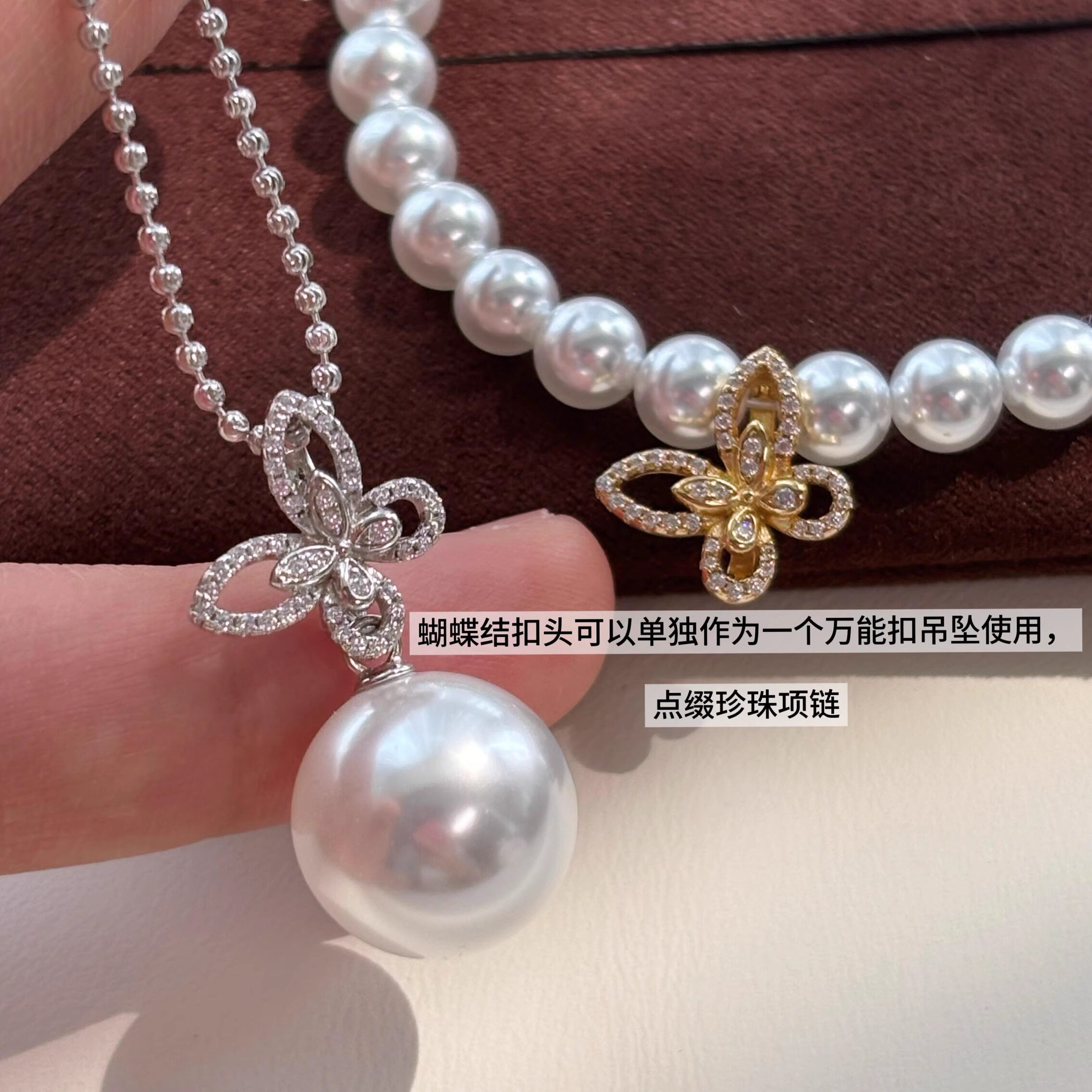 人造澳白南洋茶金珍珠蝴蝶闪钻万能扣单吊坠项链s925银高档毛衣链