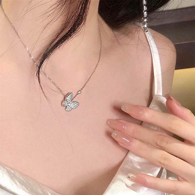 纯银满钻蝴蝶项链女钻石蝴蝶结四叶草锁骨链高级轻奢百搭生日礼物