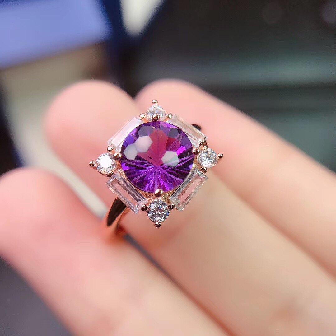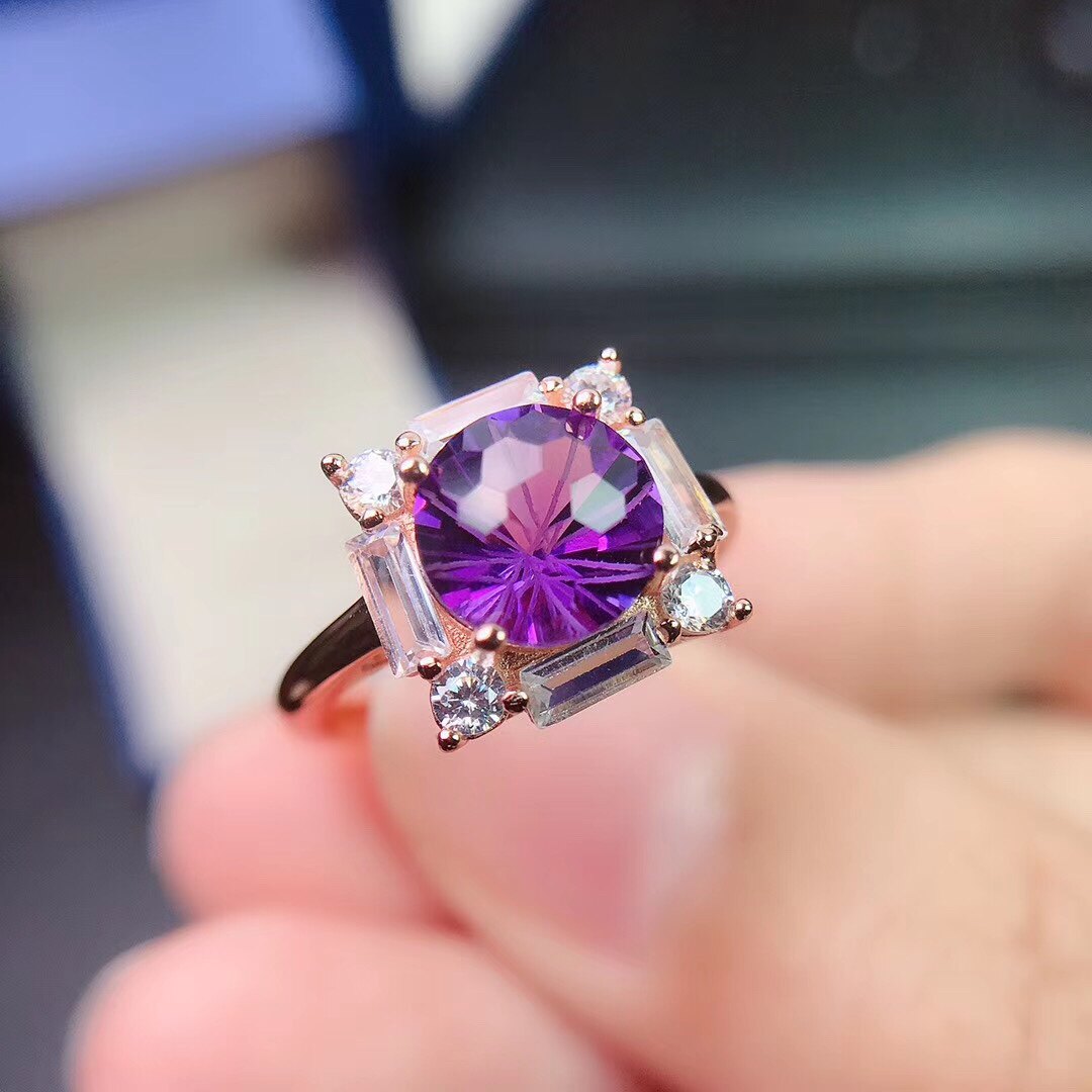 烟花切工紫水晶戒指女s925纯银托镶时尚大气紫色宝石圆形火彩好